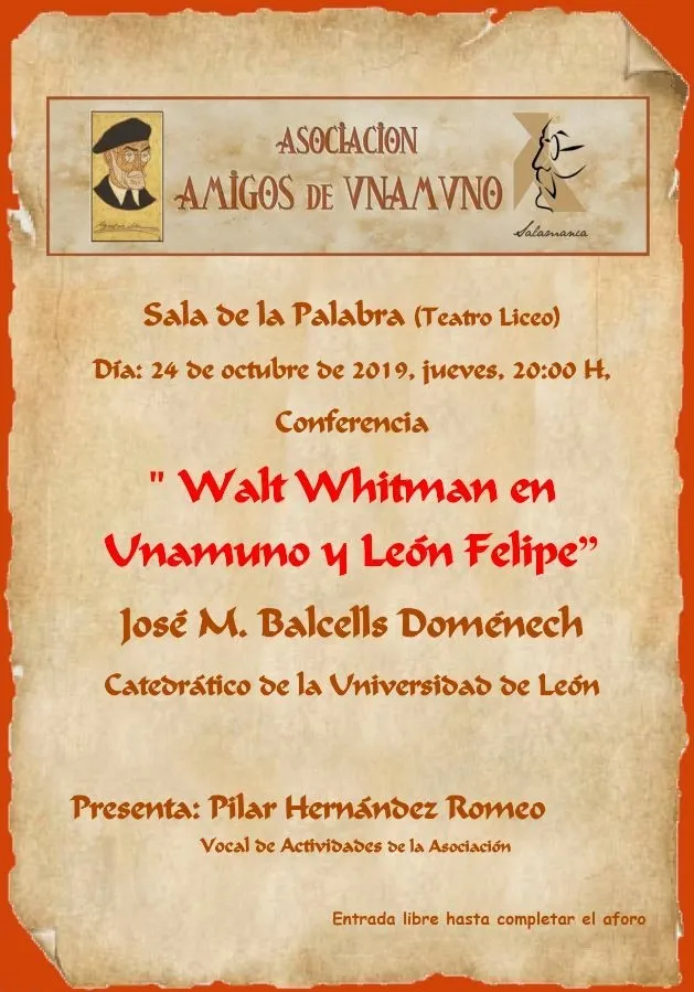 Se trata de la conferencia titulada ?Walt Whitman en Unamuno y León Felipe? que será impartida por José María Balcells Doménech, catedrático Universidad de León. Presenta: Pilar Hernández Romeo, vocal de Actividades de la asociación salmantina.