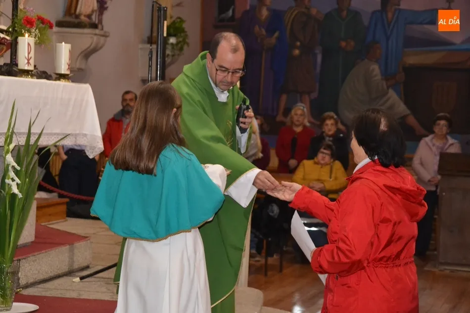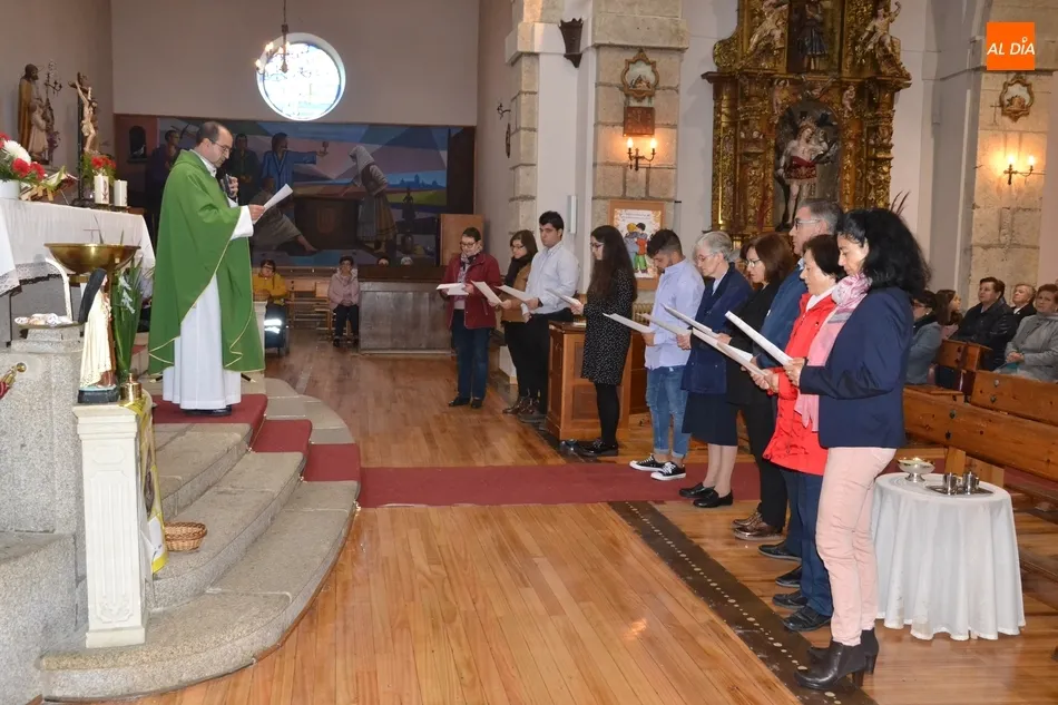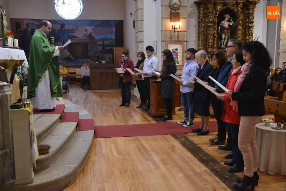 Los catequistas que pudieron asistir a la celebración se situaron en forma de semicírculo junto al altar tras la homilía ofrecida por el párroco Rafael Caño. En ese momento, uno por uno mostraron su compromiso, recibiendo todos ellos una simbólica concha con la inscripción de Bautizados en la Fe.