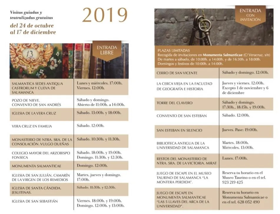 Las Llaves de la ciudad 2019 ofrece tres visitas teatralizadas con las que celebrar las siguientes conmemoraciones: 600 años de la fundación del Monasterio de Nuestra Señora de la Consolación (Vulgo de Dueñas), en el Convento de las Dueñas; 500 años de la fundación del Colegio Mayor del Arzobispo Fonseca y 100 años de la labor docente de las Jesuitinas, donde se podrá visitar la Iglesia de Santa Cándida.