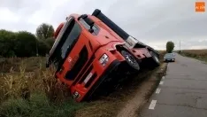 Un camión ha volcado alrededor de las 17:50 horas de este martes en la DSA-640, entre Huerta y Aldearrubia. No se ha producido ningún herido. El vuelco se produjo cuando el camión siniestrado se orilló para permitir el paso de otro camión que circulaba en dirección opuesta. Parte del cargamento de patatas que transportaba acabó esparcido por la tierra en la que cayó el vehículo.