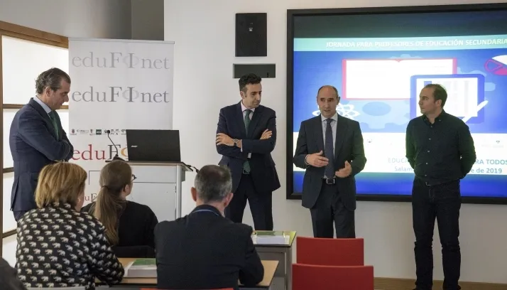La jornada sobre educación financiera, celebrada en el Aula Edufinet de la Fundación Caja Duero, ha contado con la participación de Luis Sánchez Arévalo, del Área de Programas Educativos de la Dirección Provincial de Educación en Salamanca, así como de representantes del Equipo Edufinet, José María López Jiménez, Responsable de RSC de Unicaja Banco, y de Francisco Javier Fernández González, Director de oficina de la entidad en Salamanca.