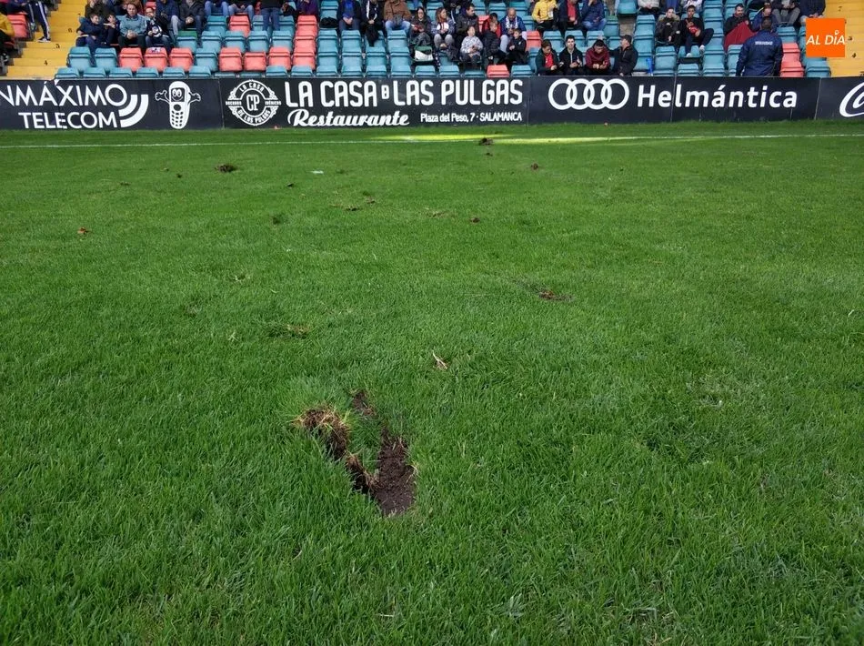Uno de los problemas que se veía a venir a corto plazo en el Salamanca UDS ya ha llegado. La carga de partidos le ha empezado a pasar factura al césped del Helmántico tras ocho encuentros en un mes. Dicha situación viene marcada por la decisión del club de que los partidos del filial como local se disputen en el feudo blanquinegro desde la presente temporada.