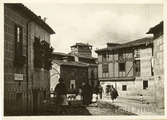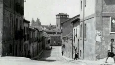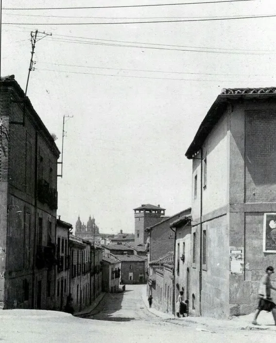 • Vista desde la zona baja de la Cuesta de la Raqueta, antes de abrir la Gran Vía, en esa cuesta, se formaba la plaza conocida como del Pozo del Campo. De la que partían, varias calles; de frente la calle de la Rosa, a la izquierda salían, la Ronda de Sancti Spiritus, la calle de la Cárcel Nueva y la calle de la Alberca, a la derecha la del Cristo de los Milagros. Al fondo podemos observar la Torre del Aire (Archivo Huebra).