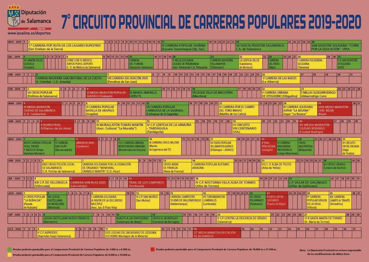 De acuerdo al calendario facilitado por la Diputación Provincial, la primera de estas pruebas tendrá lugar en Vitigudino, concretamente la legendaria San Silvestre organizada por el grupo deportivo ADOS y que se celebrará el 31 de diciembre. También en Vitigudino y seguida en el calendario, está la V Carrera Urbana de Vitigudino, que tendrá lugar el 22 de febrero.