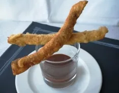 ?Chocolate con txurros? es una original y vanguardista creación que conserva toda la esencia de la comarca con rabo de añojo Dehesa Grande y las obleas Pan de Ángel de Cipérez