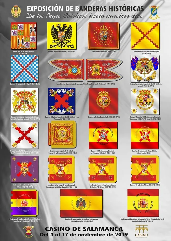 Esta muestra, organizada por el Cuartel General del Mando de Ingenieros, llega a Salamanca para mostrar a todo aquel que quiera acercarse a verla un recorrido por la historia de nuestra Bandera, patrimonio de todos los ciudadanos españoles, abarcando desde los Reyes Católicos hasta nuestros días. Cuenta con fieles reproducciones de banderas, guiones y estandartes históricos, bordadas y confeccionadas en seda.