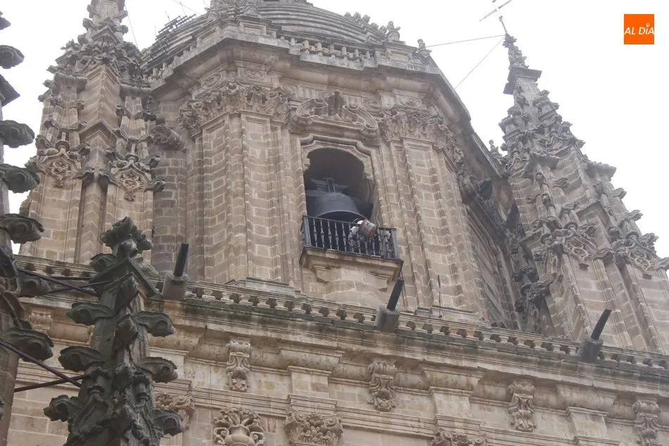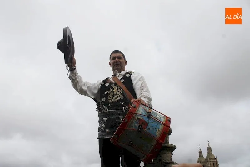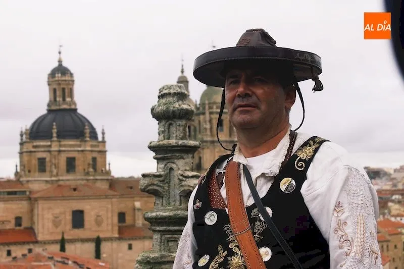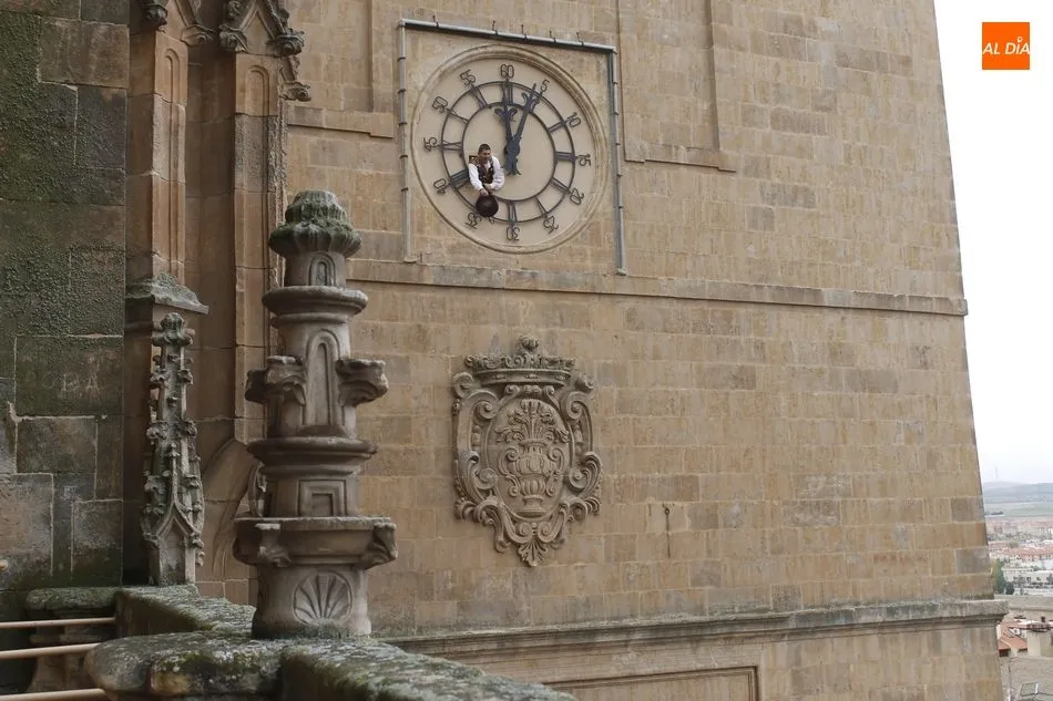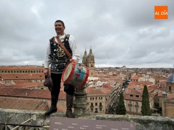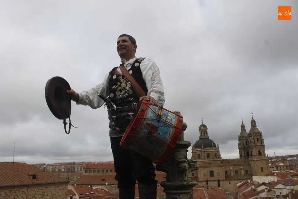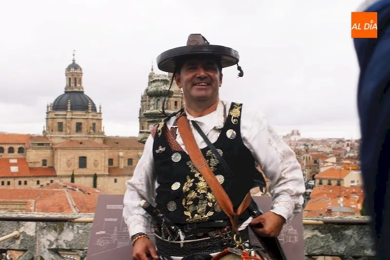 El folclorista Ángel Rufino de Haro, conocido popularmente como 'El Mariquelo', volvió este jueves a subir a lo alto de la torre de las campanas de la Catedral de Salamanca, desde donde tocó su conocida 'charrada', acompañada de su gaita y su tamboril.