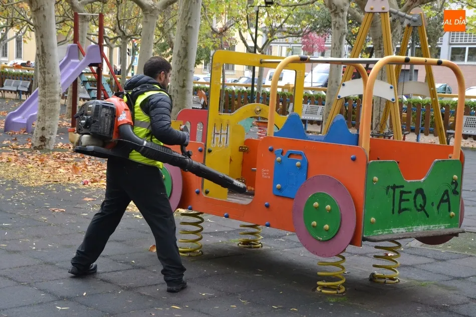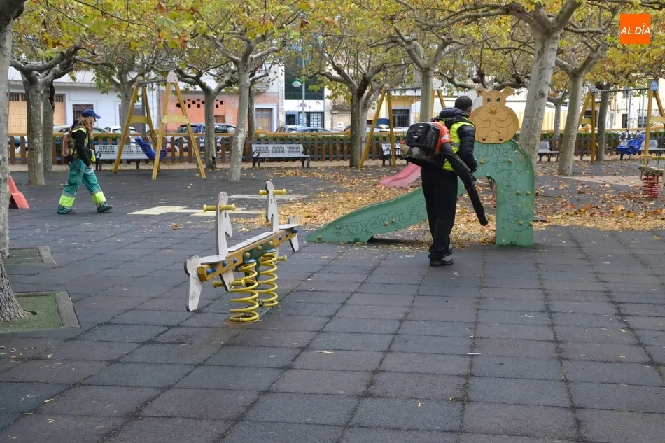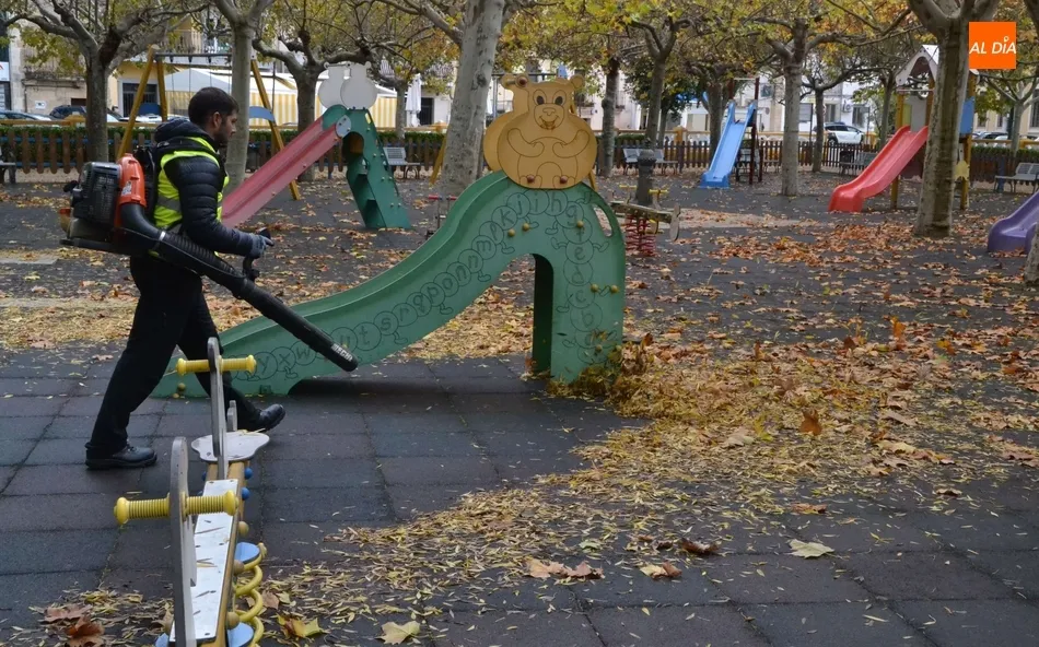Como se puede ver en las imágenes, dos personas estaban en la mañana del martes trabajando en despejar la zona con la ayuda de aparatos mecánicos. A esta tarea de retirada de hojas (y a otras del área de Jardinería) se van a sumar los alumnos de un nuevo programa mixto de formación y empleo que se ha puesto en marcha con el arranque del mes de noviembre con el título de Ciudad Rodrigo Medioambiental.