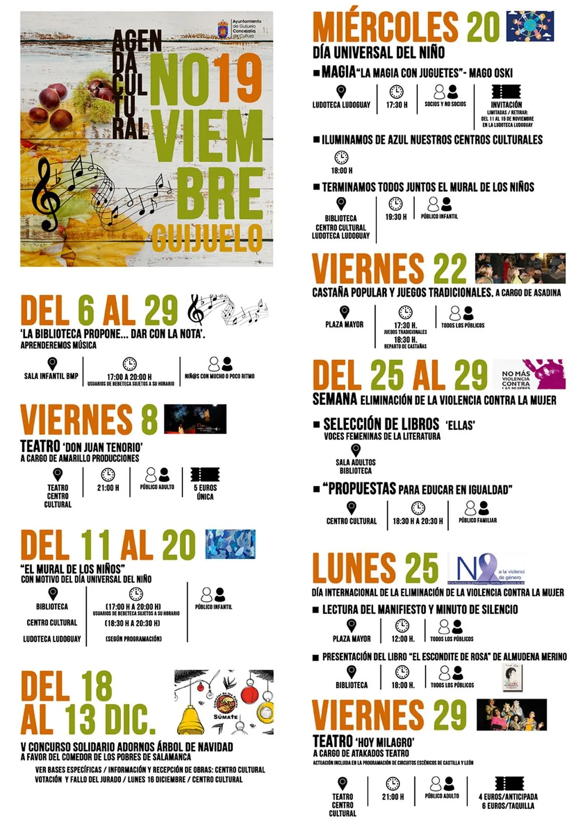 La Concejalía de Cultura del Ayuntamiento de Guijuelo ha presentado esta mañana la agenda cultural de actividades para el mes de noviembre. Destacan la celebración del Día Universal del Niño y el Día Internacional de la Eliminación de la Violencia contra la Mujer, ambos con varias propuestas para todos los vecinos. No faltará el teatro, además de la bienvenida al otoño con la tradicional castañada.
