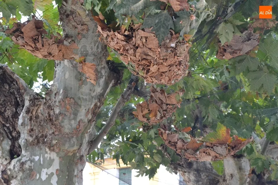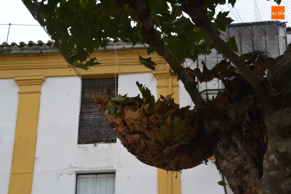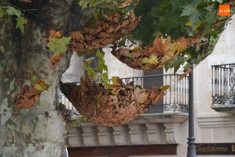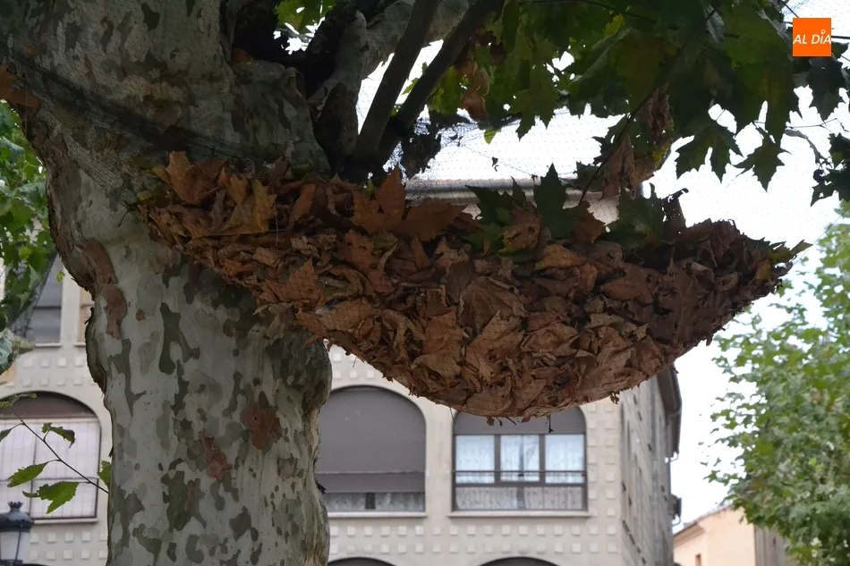 El ?truco? está en que esos árboles siguen recubiertos por las redes colocadas al principio del verano para evitar que los pájaros aniden en ellos y causen molestias, por ejemplo, a los usuarios de las terrazas que se suelen montar en ese lateral dela Plazuela. De este modo, las hojas se están acumulando, en gran cuantía, en las propias redes, como se puede comprobar en las imágenes.