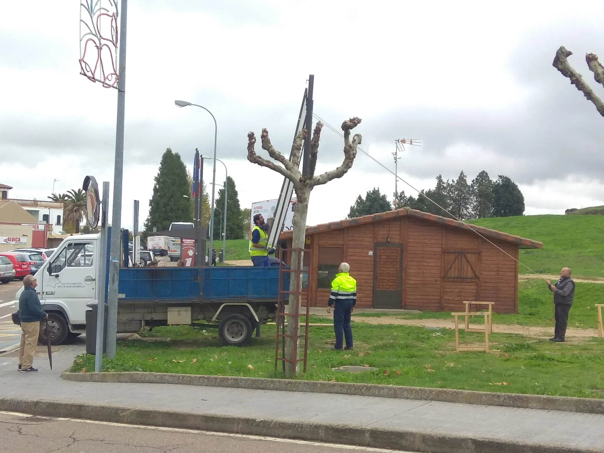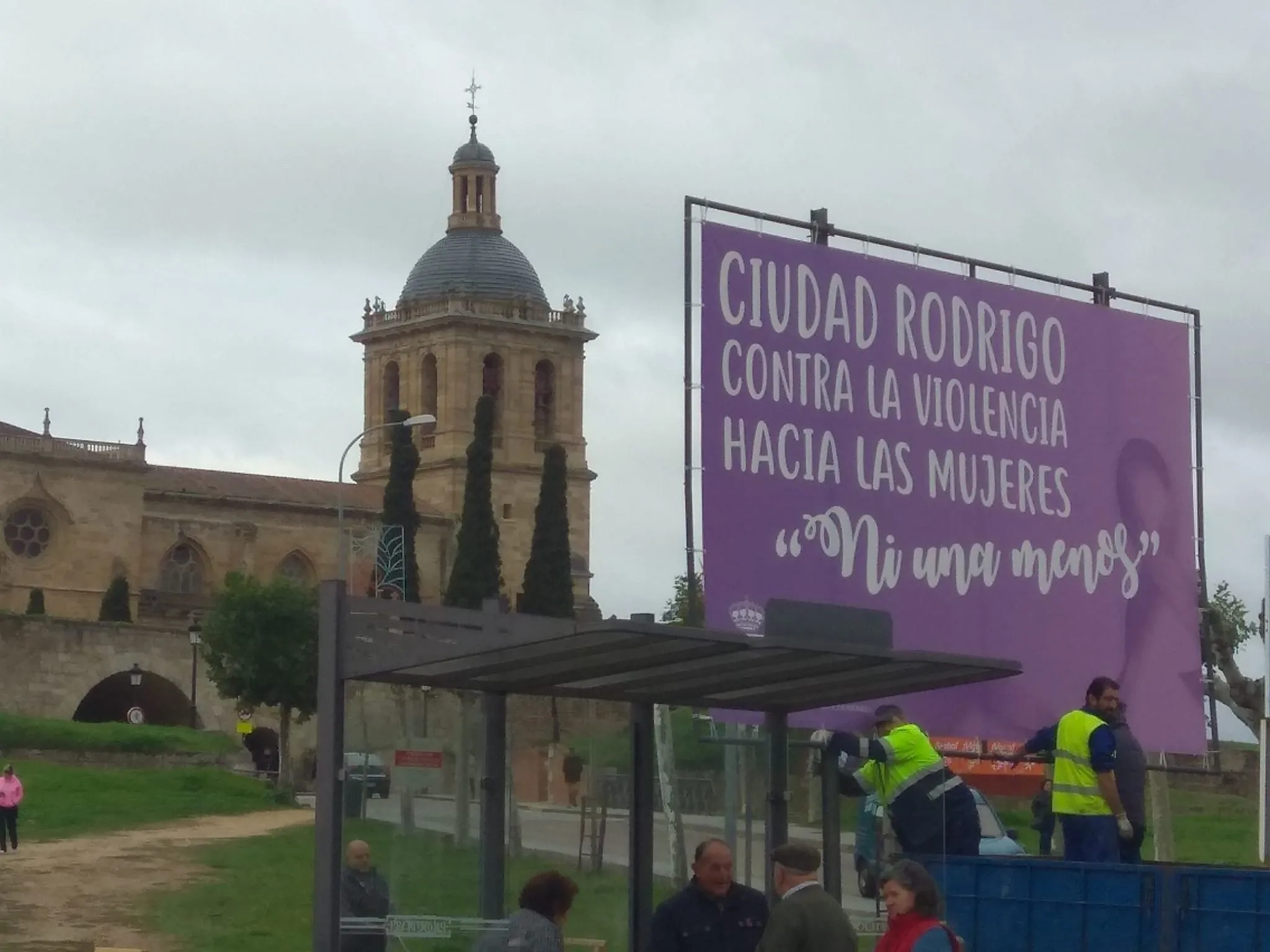Operarios del Ayuntamiento de Ciudad Rodrigo procedieron a levantar en la mañana del miércoles en la confluencia de las avenidas Sefarad y Yurramendi una pancarta de color morado alusiva a la próxima conmemoración del Día Internacional para la Eliminación de la Violencia hacia las Mujeres, que aparece en el calendario el lunes 25.