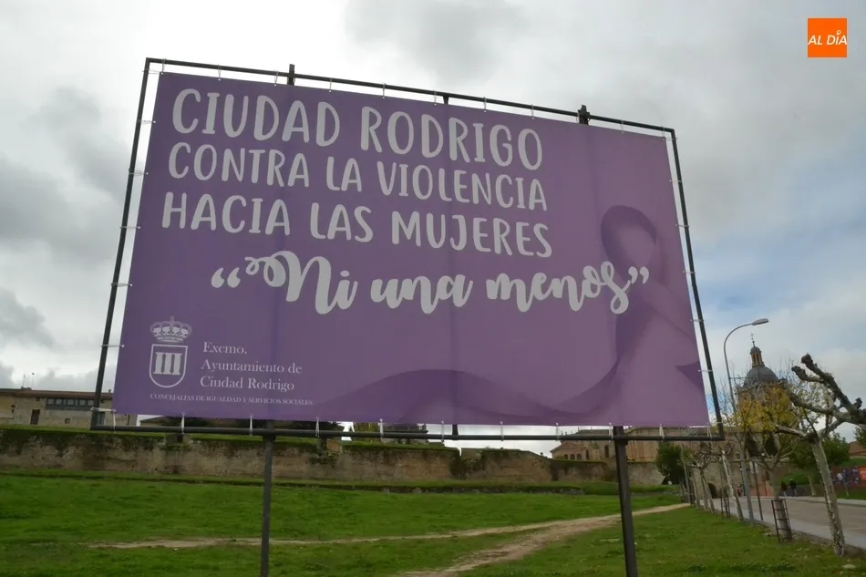 Esta pancarta, que se colocó por primera vez hace dos años (en el mismo lugar), luce el lema Ciudad Rodrigo contra la violencia hacia las mujeres. Ni una menos, figurando en la parte inferior el nombre y el escudo del Ayuntamiento mirobrigense, junto al nombre de las concejalías de Igualdad y Servicios Sociales, promotoras de la iniciativa.