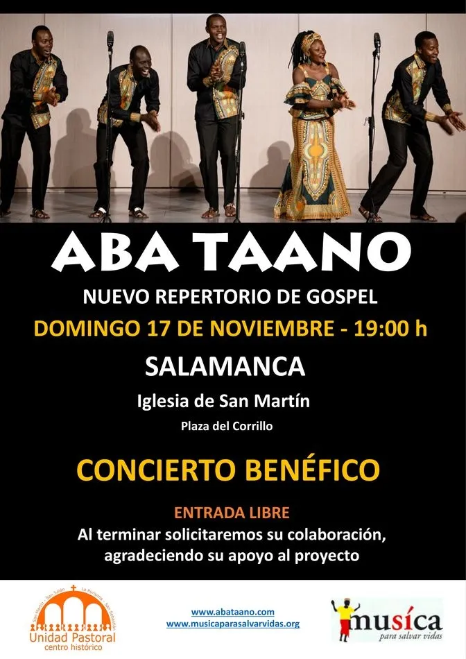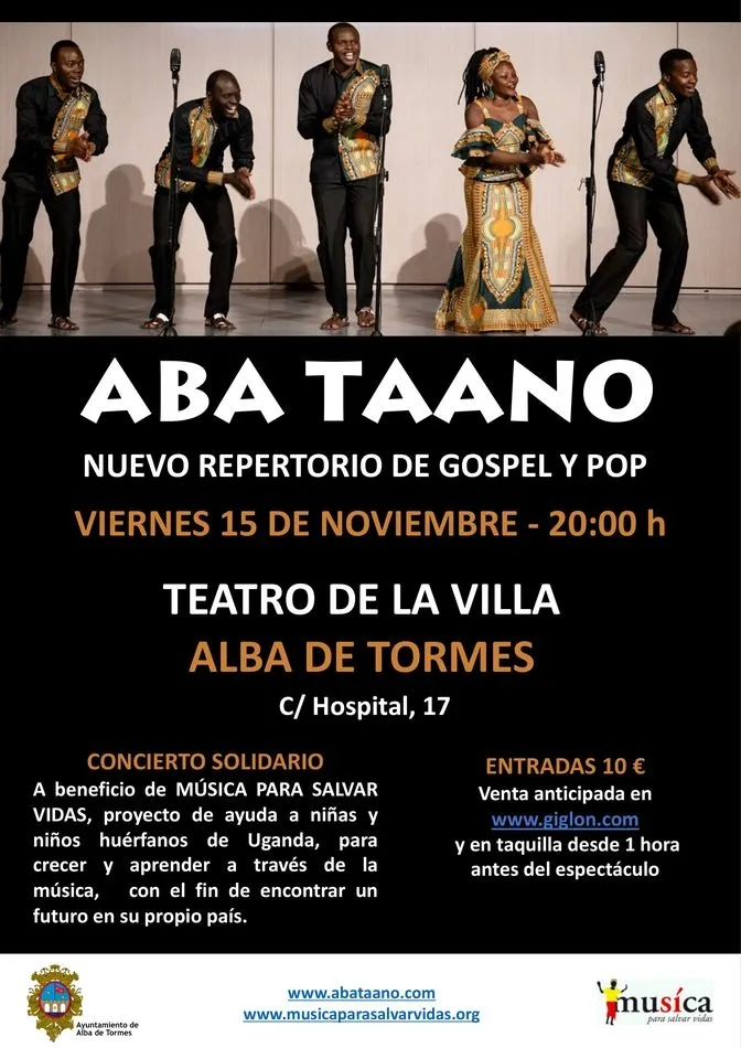 Aba Taano es un quinteto vocal Ugandés con 3 bajos, un barítono y una mezzo, que revoluciona la manera de cantar góspel. Góspel africano, góspel de Uganda, de Sudáfrica, góspel escenificado, con un profundo mensaje espiritual pero con tremendo dinamismo. Un quinteto que surge de un proyecto humanitario llevado en Uganda por la pequeña ONG Música Para Salvar Vidas, donde los componentes de Aba Taano (algunos de ellos desde el primer día del proyecto) se han transformado hoy en día en los padrinos y madrinas de los niños y niñas que conviven actualmente en el orfanato en Kireka (en las afueras de Kampala). En sus diez años de historia Aba Taano ha cosechado 8 premios internacionales, ha grabado cinco discos y ha realizado más de 1500 conciertos como grupo individual. Es altamente reconocido por todos los públicos y el mayor apoyo a nivel financiero de Música Para Salvar Vidas.