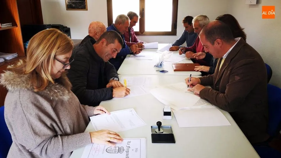 Los alcaldes de Ahigal de los Aceiteros, Sobradillo, La Fregeneda, La Bouza y representantes de la Cámara de Figueira de Castelo Rodrigo estamparon su firma en el acto celebrado en La Bouza