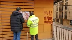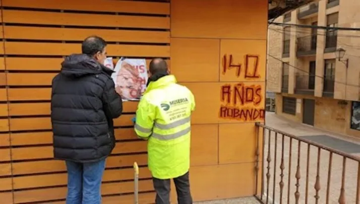 Se podían leer frases como '140 años robando' y otras que responsables del Partido Socialista han tapado con carteles hasta que un profesional ha procedido a su limpieza
