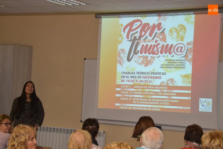 El programa se compone de un total de 4 charlas teórico-prácticas, que serán impartidas a lo largo de noviembre por la terapeuta ocupacional y musicoterapeuta Virginia Hernández. La primera de ellas en la tarde del jueves (que fue introducida por la delegada de Mayores, Davinia Montero), versó sobre los hábitos de vida saludables (se trataron la alimentación sana, la hidratación o el ejercicio físico), asistiendo a la misma una treintena de personas.