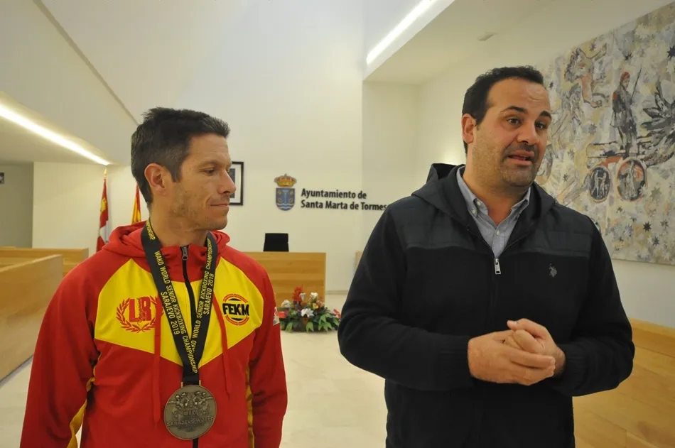 El alcalde de Santa Marta, David Mingo, y la concejal de Deportes, Silvia González, recibieron al deportista Alfonso García Parra tras conseguir la medalla de bronce en el mundial de Full Contact veteranos en modalidad Light Contact celebrada en Bosnia.
