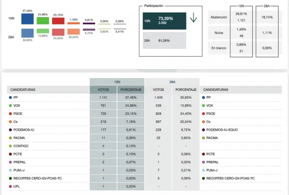 El Partido Popular sumó un total de 1.141 votos, un 7% más que el 28 de abril, mientras que Vox consiguió 761, un 9% más que hace siete meses. Por su parte el PSOE logra 705 votos, en total 123 menos que en abril.