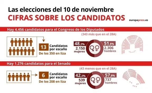 Un total de 4.456 candidatos (2.306 hombres y 2.150 mujeres) competirán en las elecciones generales de este domingo por un puesto en el Congreso de los Diputados, lo que supone una media de 13 aspirantes por cada uno de los 350 asientos que conforman la Cámara Baja.