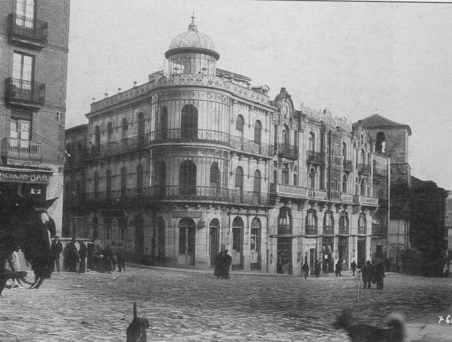 Situado en la esquina calle Pozo Amarillo con la plaza del Mercado, se caracteriza por ser una construcción modernista, obra de Cecilio González-Domingo en el año 1909, quien diseñó un mirador circular haciendo juego con un pabellón cupuliforme del ático.