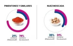 En concreto, de los 12 tipos de micotoxinas buscados, OCU ha localizado dos (Ocratoxina A, Aflatoxina B1 o ambas) en el 71% de los productos; sobre todo en los que llevan algún derivado del pimiento (77% de las muestras) pero también en la nuez moscada (46%). En dos casos concretos, además, las cantidades encontradas están por encima del límite legal establecido por la normativa europea.