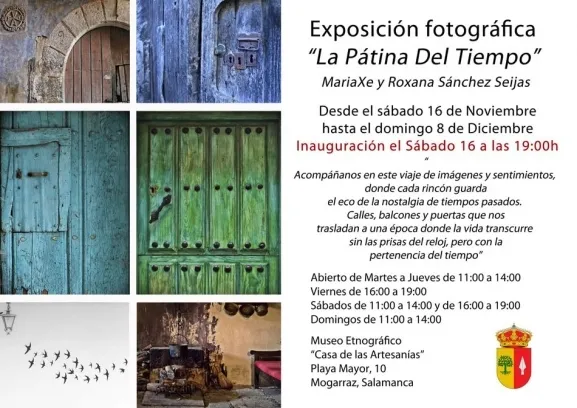 Mogarraz acoge hoy la apertura de la exposición ?La Pátina del Tiempo?, de MariaXe y Roxana Sánchez Seijas. Una muestra artística que según las propias autoras se trata de un ?viaje de imágenes y sentimientos, donde cada rincón guarda el eco de la nostalgia de tiempos pasados. Calles, balcones y puertas que nos trasladan a una época donde la vida transcurre sin las prisas del reloj, pero con la pertenencia del tiempo?.