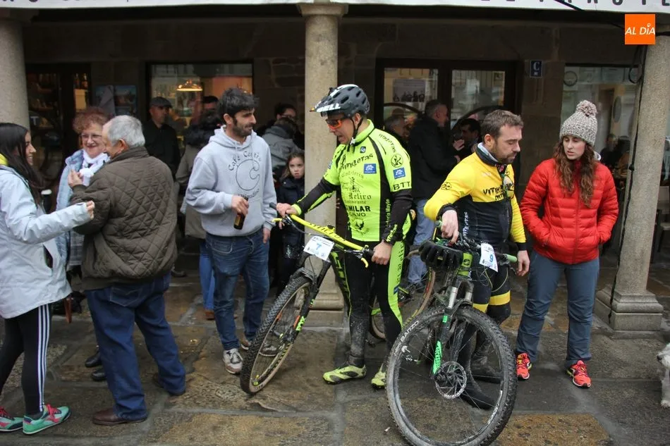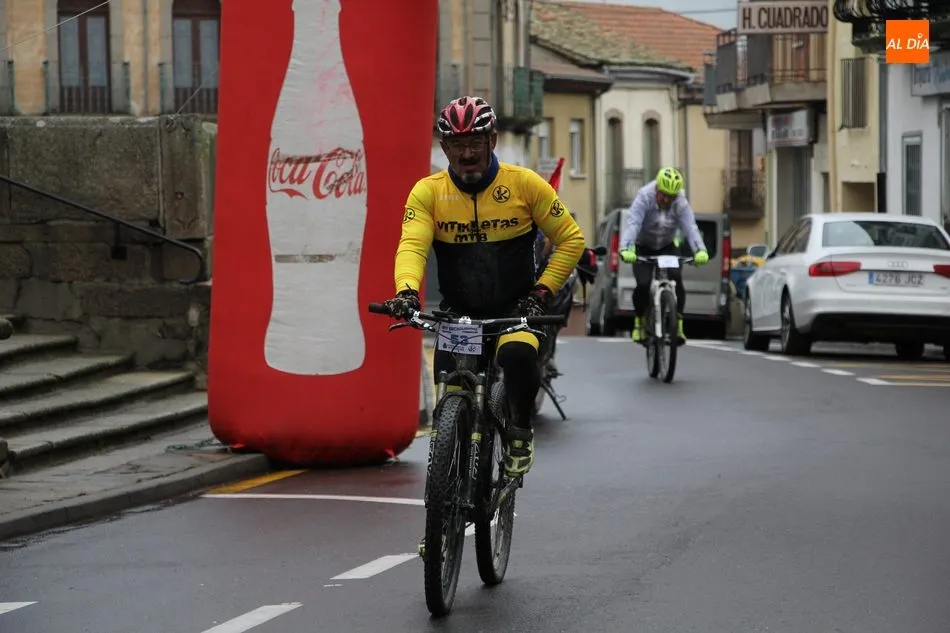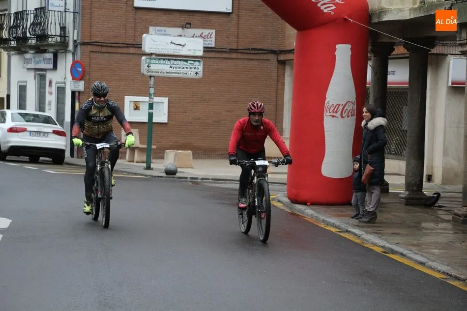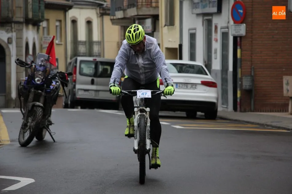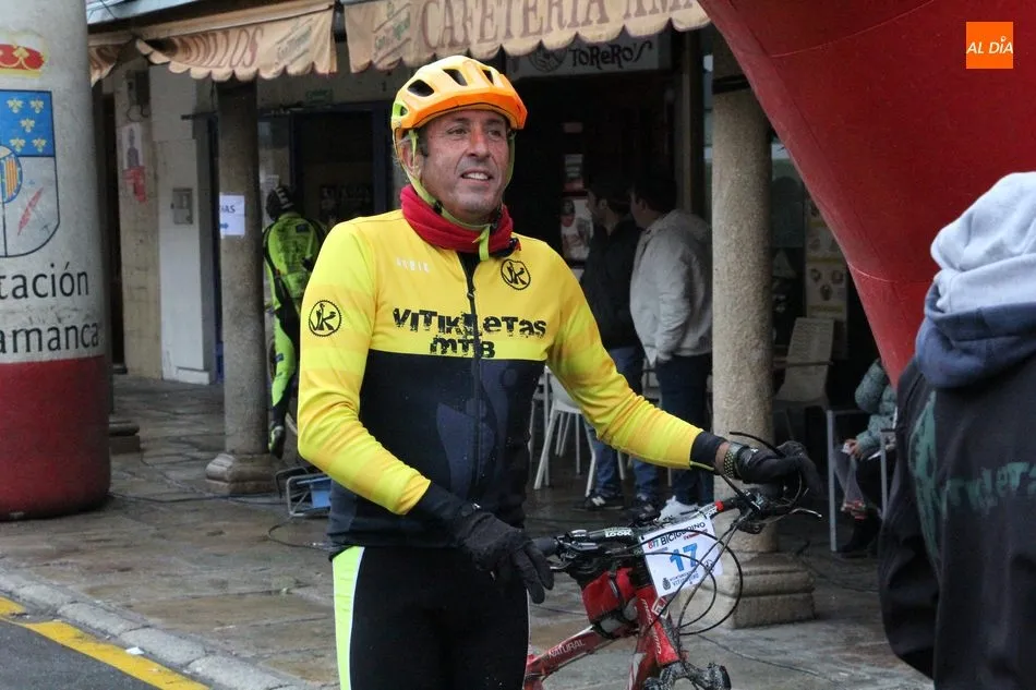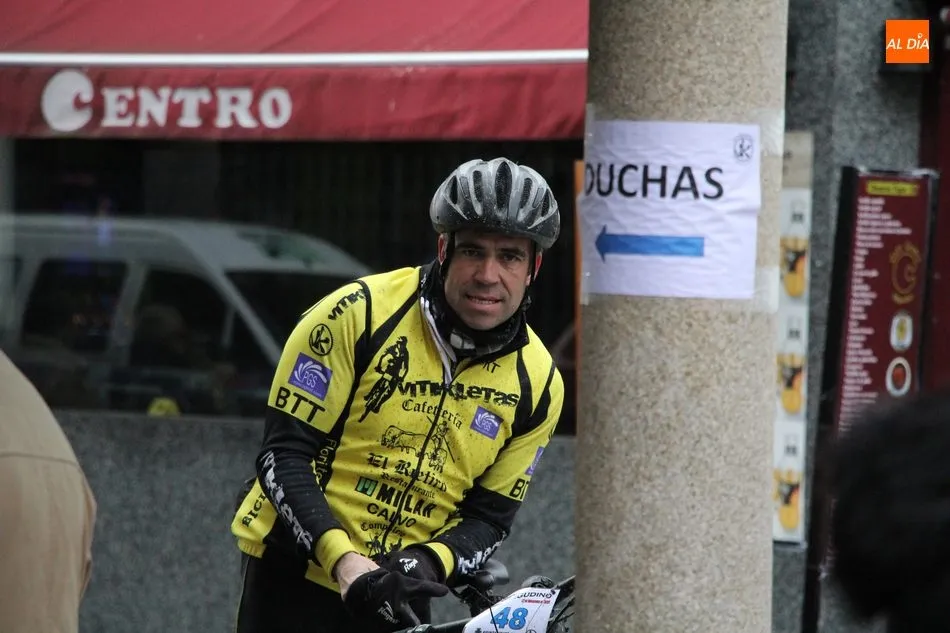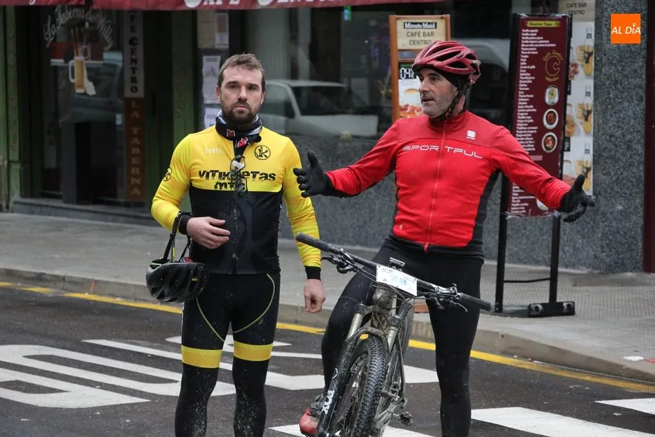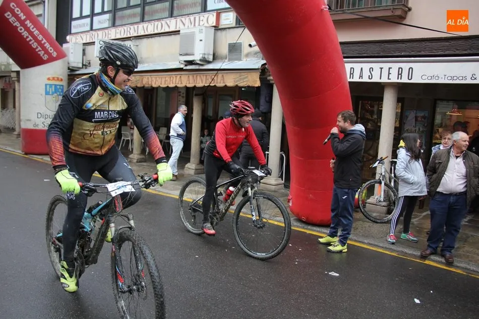 Algo más de medio centenar de aficionados a la bicicleta de montaña tomaban la salida en la Plaza de España para enfrentarse bajo la lluvia a un recorrido de 56 kilómetros