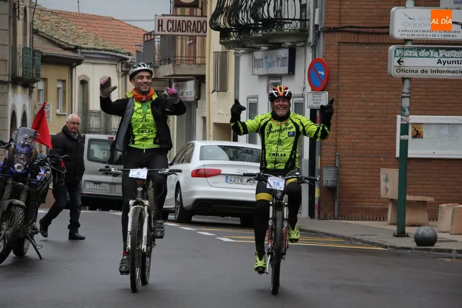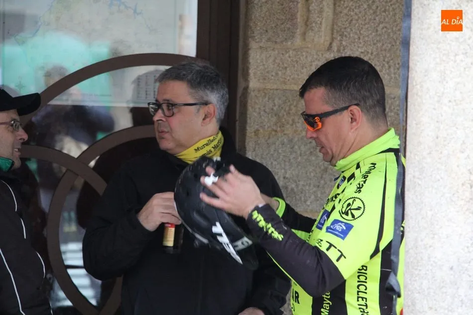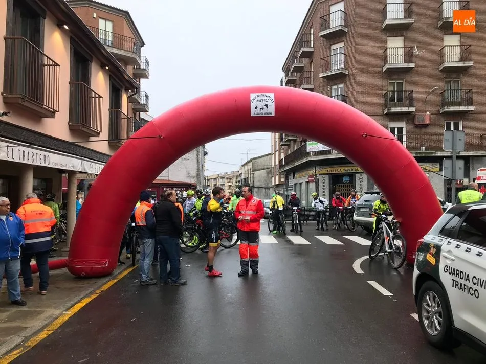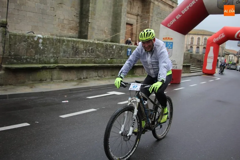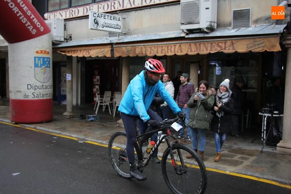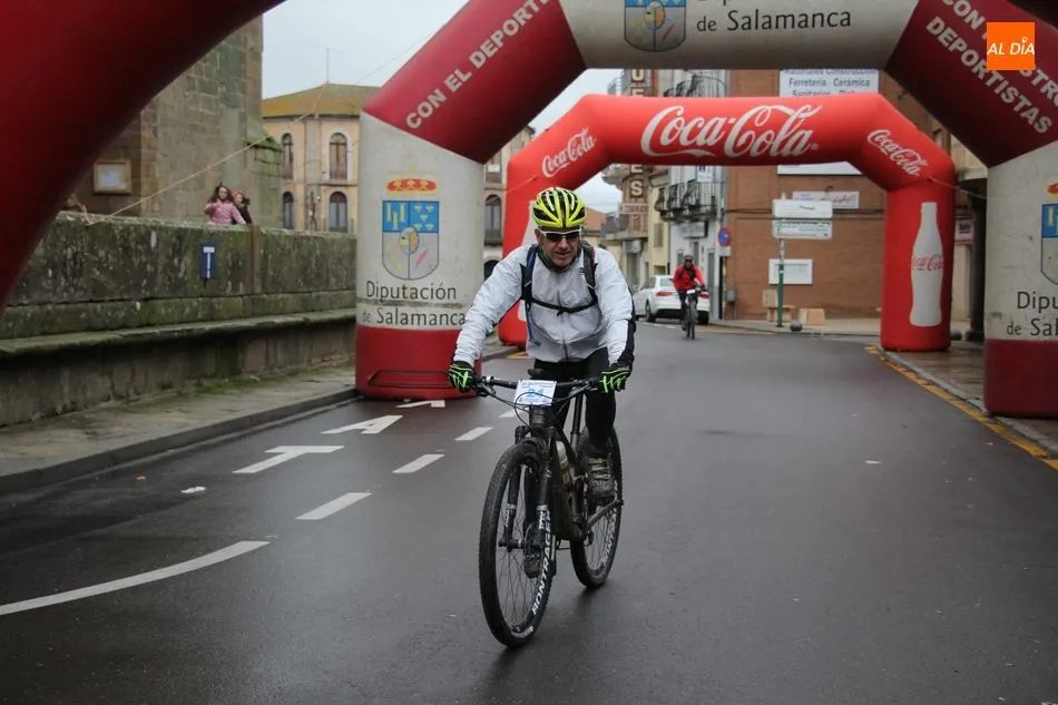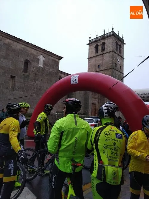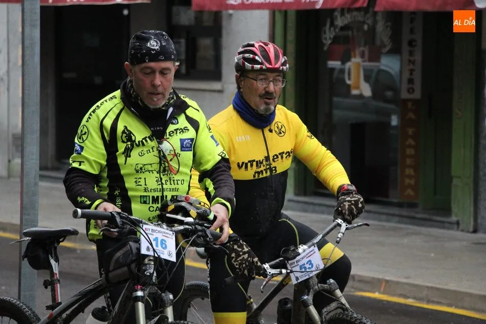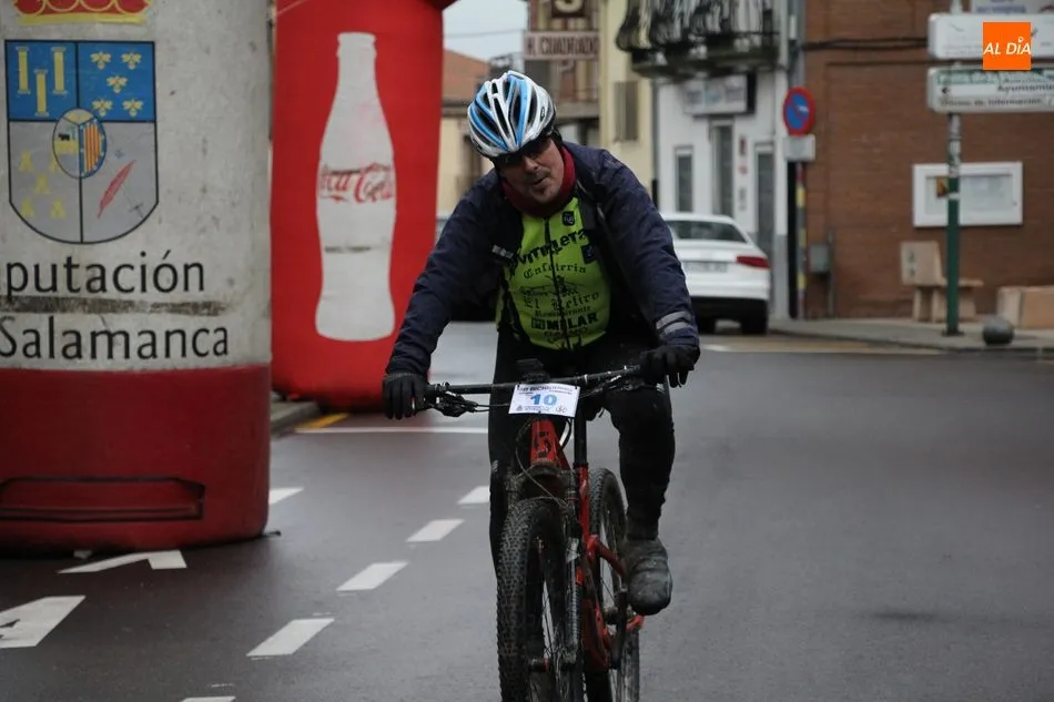 Algo más de medio centenar de aficionados a la bicicleta de montaña tomaban la salida en la Plaza de España para enfrentarse bajo la lluvia a un recorrido de 56 kilómetros