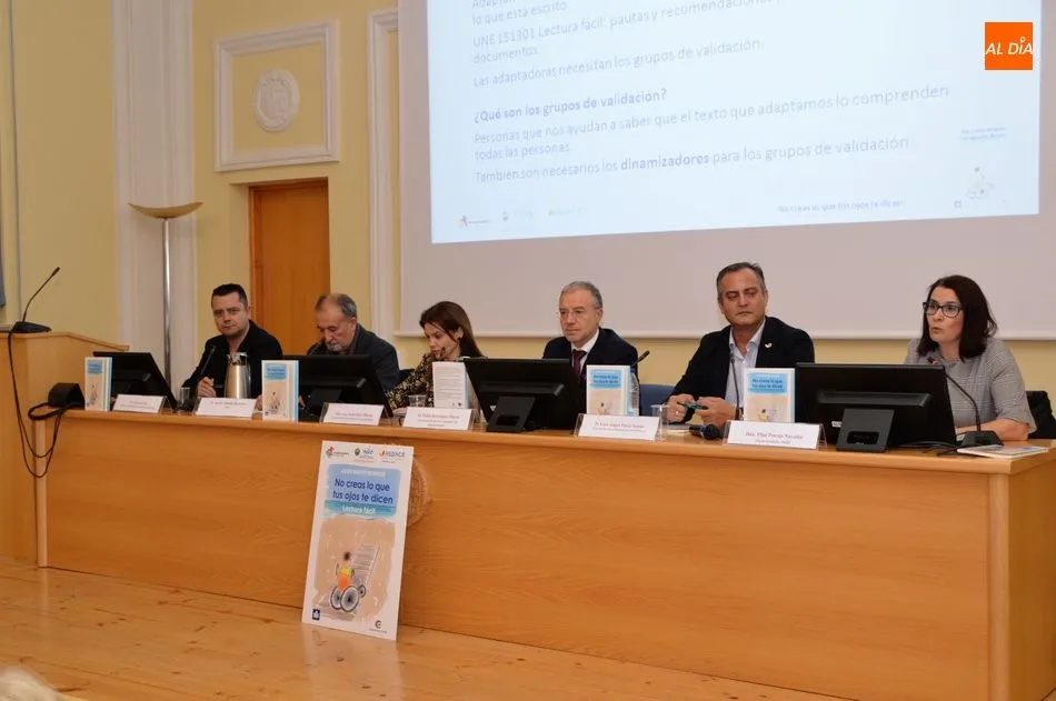 En el acto de presentación han intervenido el director general de personas mayores, personas con discapacidad y atención a la dependencia, Pablo Rodríguez Hoyos, la vicerrectora de Estudiantes y Sostenibilidad, Ana Ríos Hilario; el presidente de la Federación ASPACE Castilla y León, Luís Ángel Pérez Sotelo; el subdirector de INICO, Emiliano Díez; el autor del libro, Javier Martín Betanzos; y una de las adaptadoras, Pilar Porras.