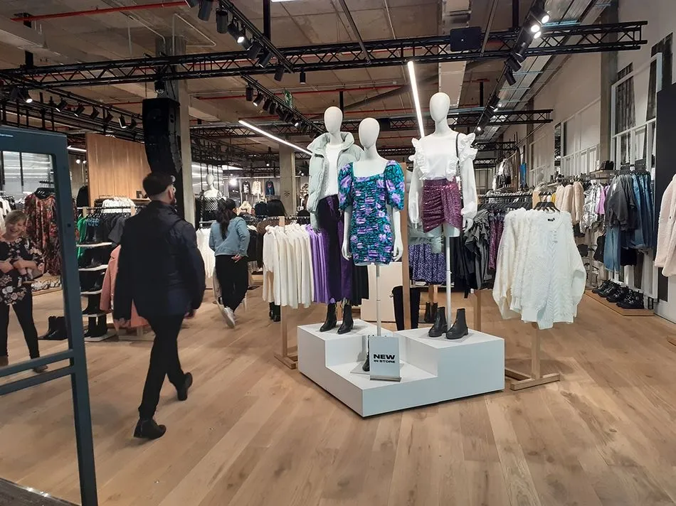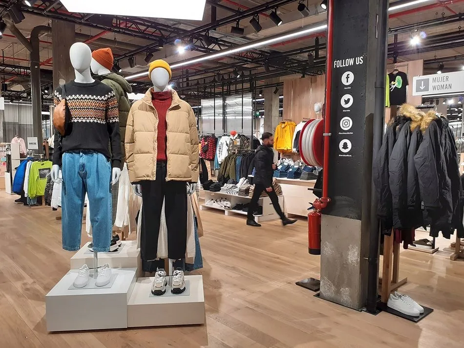 El nuevo diseño de la tienda consiste en una estructura con techos abiertos que dejan ver el propio esqueleto del local, donde se encuentra suspendida la iluminación y los altavoces, a su vez, los muebles y panales de las paredes se pueden desplazar con facilidad para adaptarse a las necesidades de cada campaña.