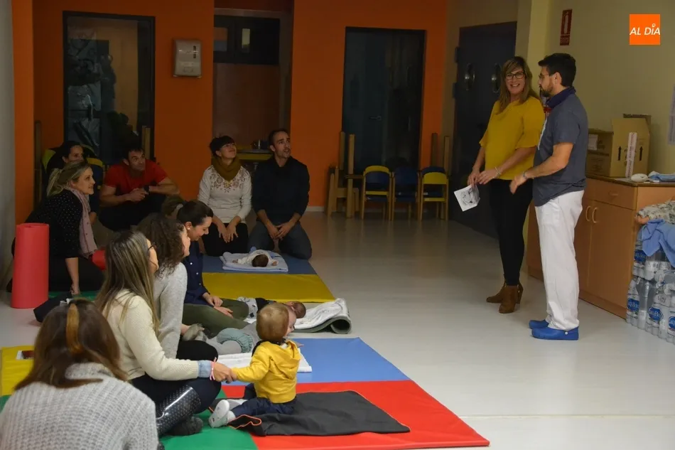 Ellos fueron los protagonistas de un taller de masaje, en el que los progenitores asistentes fueron aplicando a sus bebés las indicaciones del encargado de impartir la actividad, el matrón del Centro de Salud y Especialidades de Ciudad Rodrigo, Miguel Ángel Velasco, quién fue presentado por la delegada de Servicios Sociales del Consistorio, Davinia Montero.