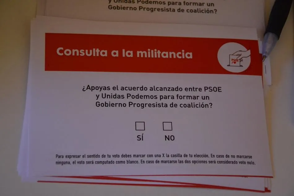 Finalizado el tiempo de votación a las 20.00 horas, se procedió a abrir la urna, que arrojó como resultado que el 100% de los que han acudido a votar dan su visto bueno al acuerdo, al responder ?Sí? a la pregunta de la papeleta, que exactamente rezaba así: ?¿Apoyas el acuerdo alcanzado entre PSOE y Unidas Podemos para formar un Gobierno Progresista de coalición??.