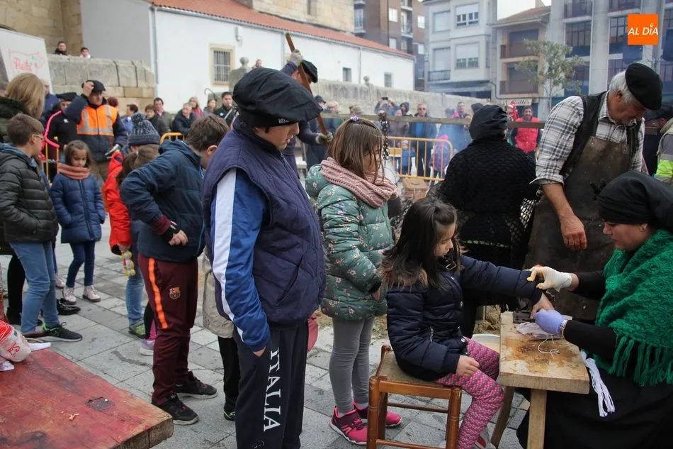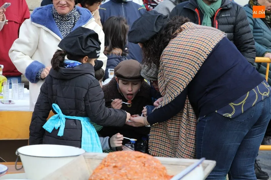 Bajo la mirada de admiración de los más pequeños, Juan iba extrayendo una a una las partes del cerdo, mientras Toñi y Conchi limpiaban patas o guisaban chichas a la lumbre. Entre tanto, Chema, Briki y Jose guisaban al butano unas chichas para engañar al hambre de los colaboradores más pequeños, encargados del reparto de dulces y pastas, y después de participar en el taller de elaboración de chorizos.