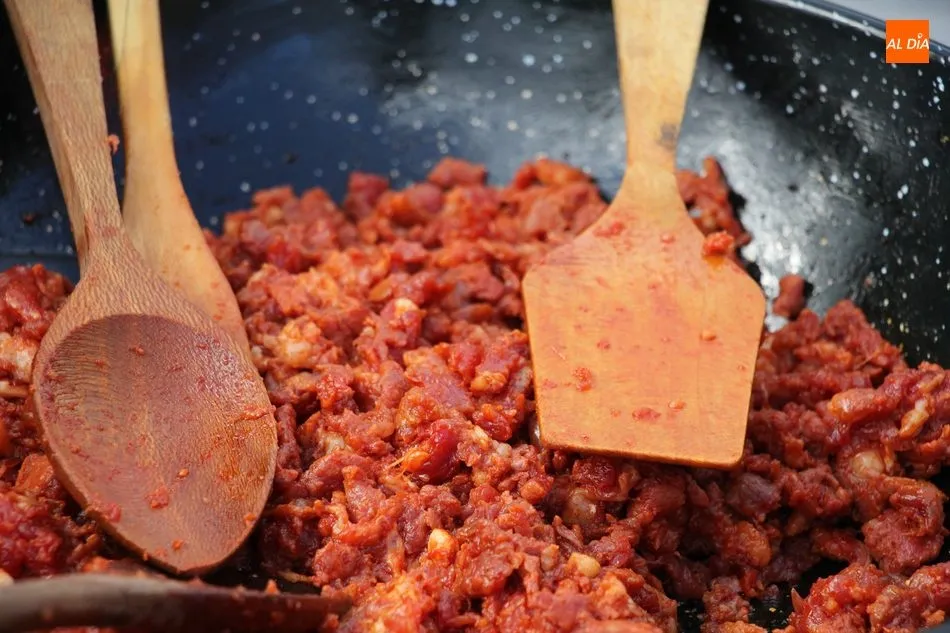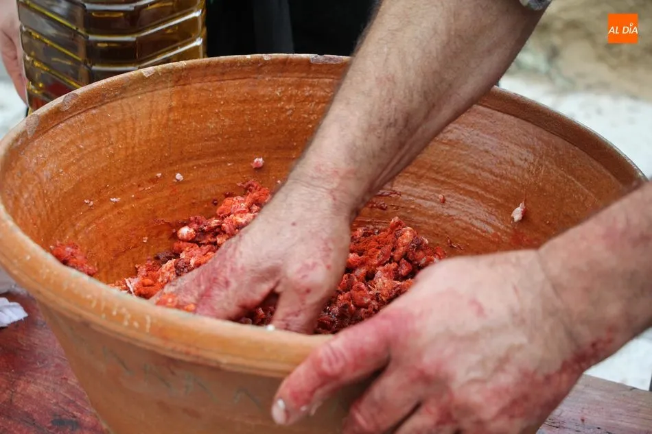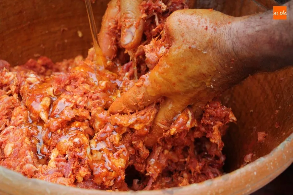 Juan ya había deshuesado jamones y paletas, lo que daría paso al picado de la carne y su adobo, labor esta última en la que contaría con Toñi, encargada de aliñar con ajo, sal, orégano y pimentón las chichas, que con el amasado de las fuertes manos de Juan, comenzaban a tomar color.