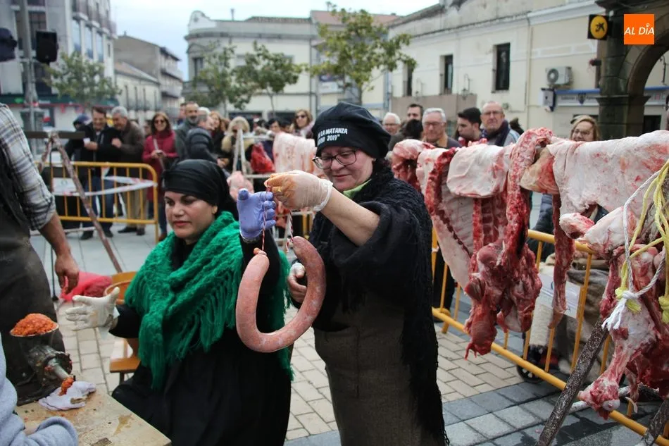 Otros protagonistas de la jornada fueron Juan ?el de Cabeza de Framontanos? y Toñi, su mujer, también Conchi González, encargados de despiezar, limpiar, aderezar y cocinar lo que emana de la matanza tradicional, participación totalmente altruista y que conviene señalar. A ellos se sumaba un numeroso equipo de colaboradores y empleados municipales, comenzado por la alcaldesa Luisa de Paz, que no le costó remangarse para hacer el primer chorizo en la máquina de embuchar, echar las chichas a la artesa e incluso repartirlas para su degustación por todo aquel que se acercó a la Plaza.