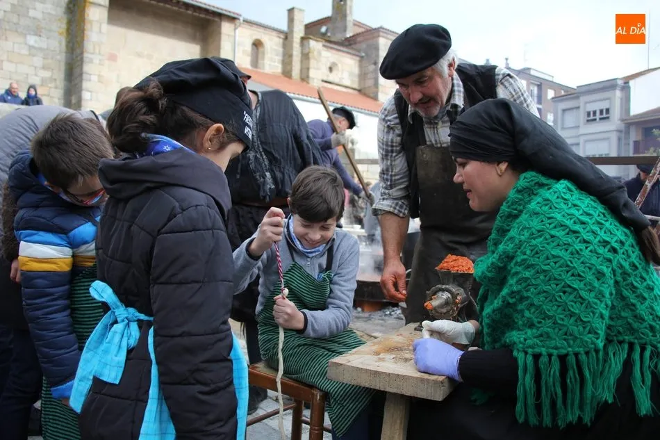 Conchi seguía cocinando las chichas a las lumbre y los niños comenzaban a acudir a la máquina de embuchar para hacer su chorizo, toda una experiencia y que sus padres y abuelos recordarán para siempre.