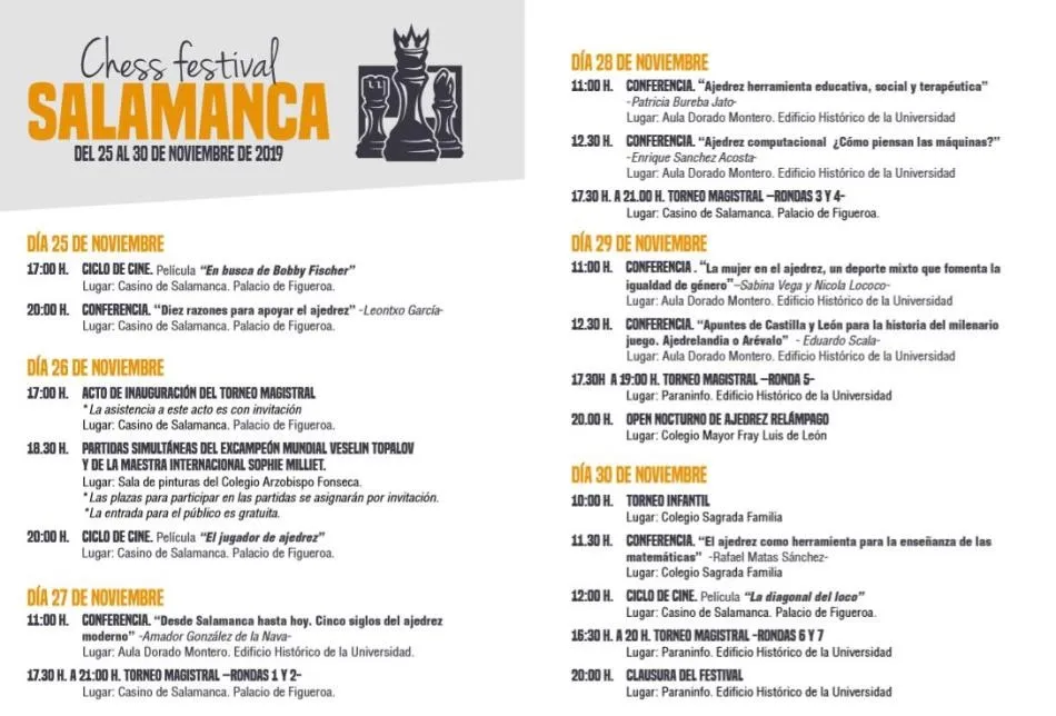 PROGRAMA de la segunda edición del Festival de Ajedrez VII Centenario, con la presencia del vencedor de la pasada edición el ex campeón del mundo Vesselin Topalov.También están confirmados la campeona mundial Hou Yifan y el gran maestro ucraniano y ex campeón mundial Ruslan Ponomariov.