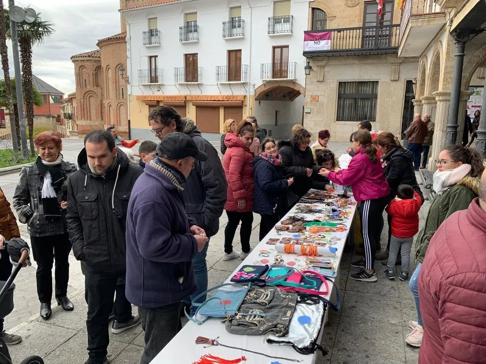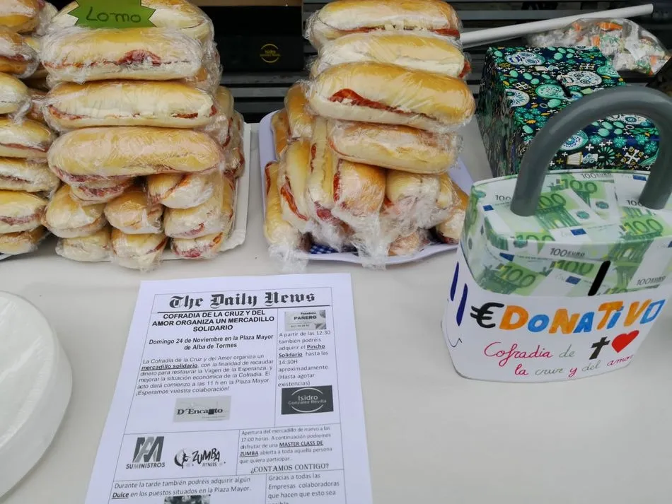 Desde primeras horas de la mañana, el mercadillo ocupó los soportales de la Plaza Mayor y los integrantes de la cofradía vendieron productos donados por D'Encanto, Suministros Miguel Angel, Taxis Manuel y Paula, Fitness Pilar Hernández, Isidro González Revilla y Panadería Pañero.