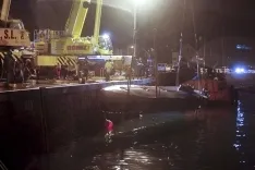 Tras varias jornadas de maniobras para reflotar y remolcar el 'narcosubmarino' desde la zona del hundimiento, a zona de Punta Couso, en la madrugada del pasado miércoles se pudo izar la nave con dos grandes grúas instaladas en el puerto de Aldán.