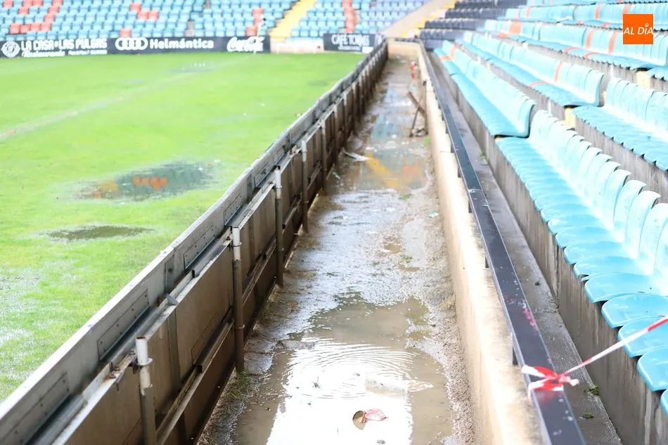 El césped del Estadio Helmántico está al borde del colapso. El tapete verde de la ?tercera Catedral? de la ciudad presentó un aspecto bochornoso en el encuentro del filial del Salamanca UDS y el Astorga por las intensas lluvias que azotaron a la localidad charra en los últimos días.