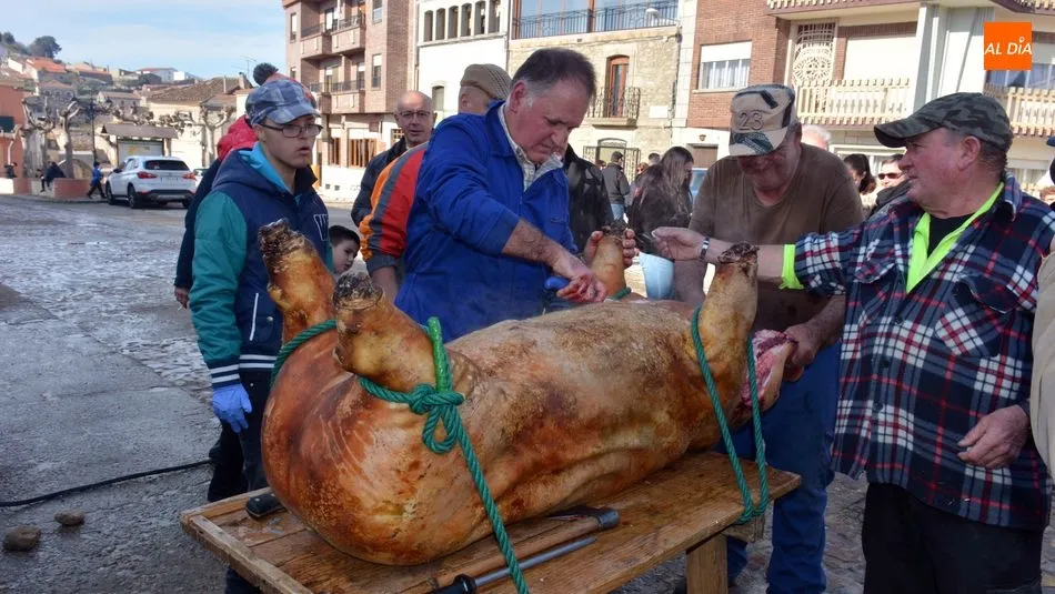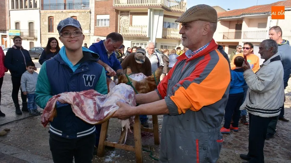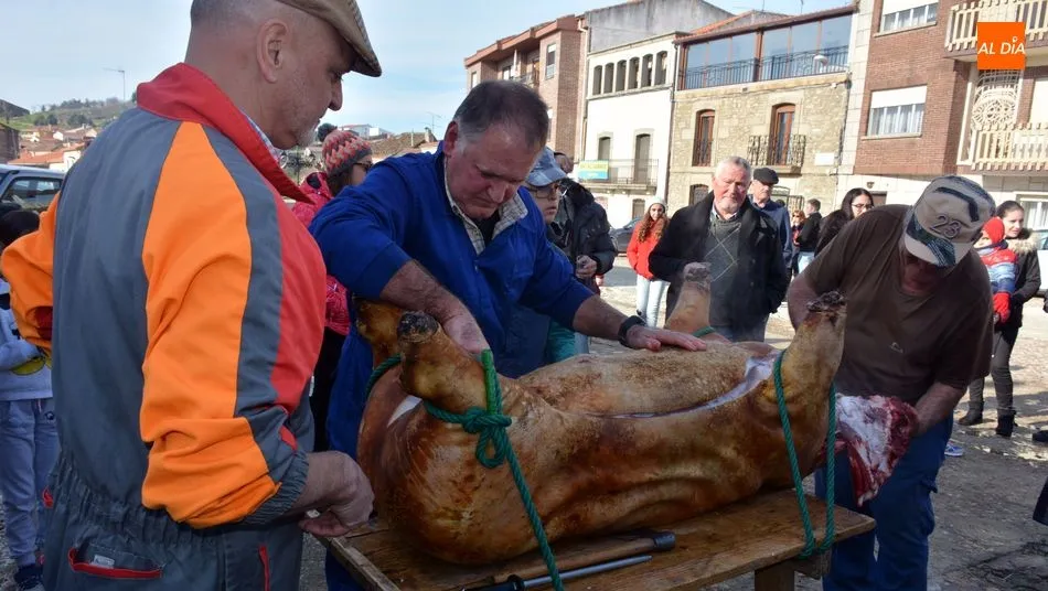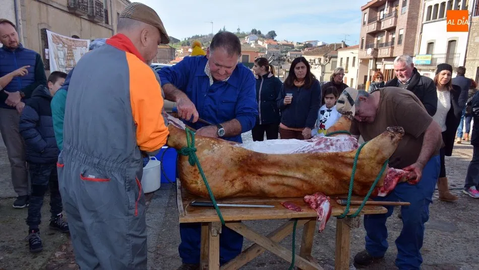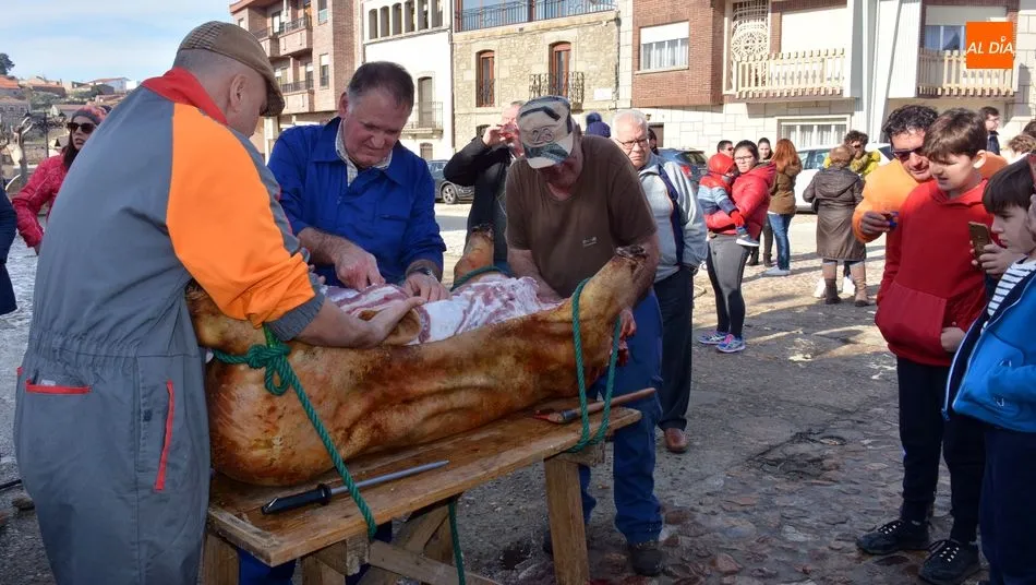 Una vez limpio, el cerdo de 130 kilos de peso fue sujetado sobre el tajo y se inició el proceso del despiece dirigido por Juan José Sánchez Gamito, el Matancero de Honor del 2019. Ayudado por varios amigos y vecinos, el matancero fue cortando con suma destreza las diferentes piezas del cerdo, desde la jeta, hasta las costillas y los lomos. Esta tarea fue seguida con gran atención especialmente por los niños y por gente de todas las edades llegadas de fuera, niños y jóvenes que participaban por primera vez en una jornada matancera.