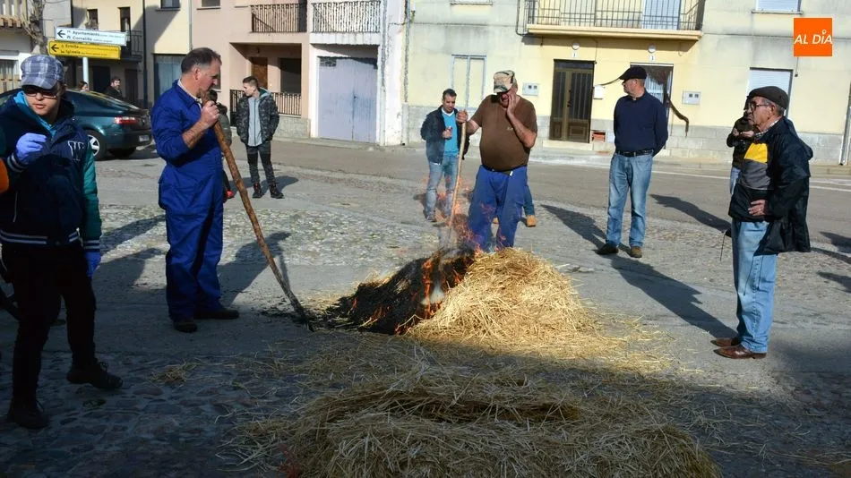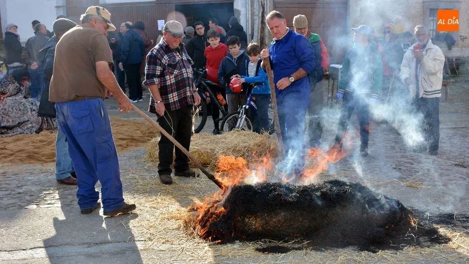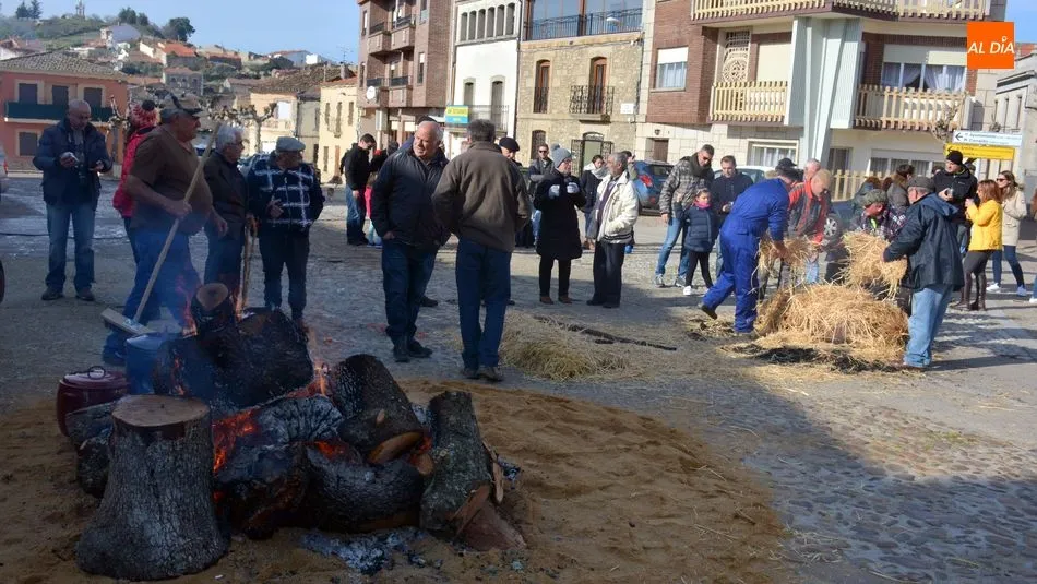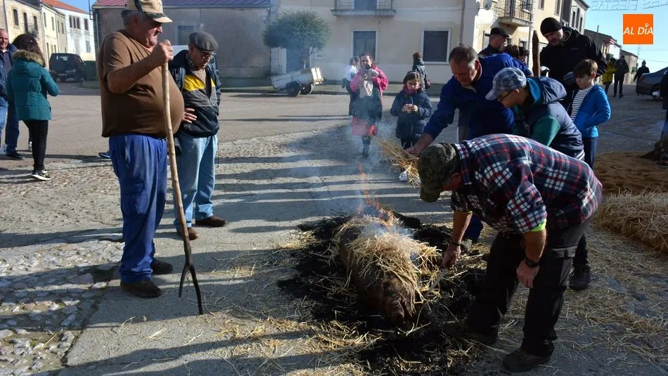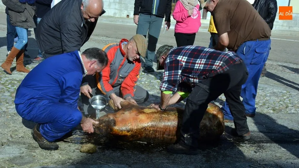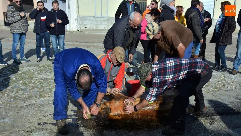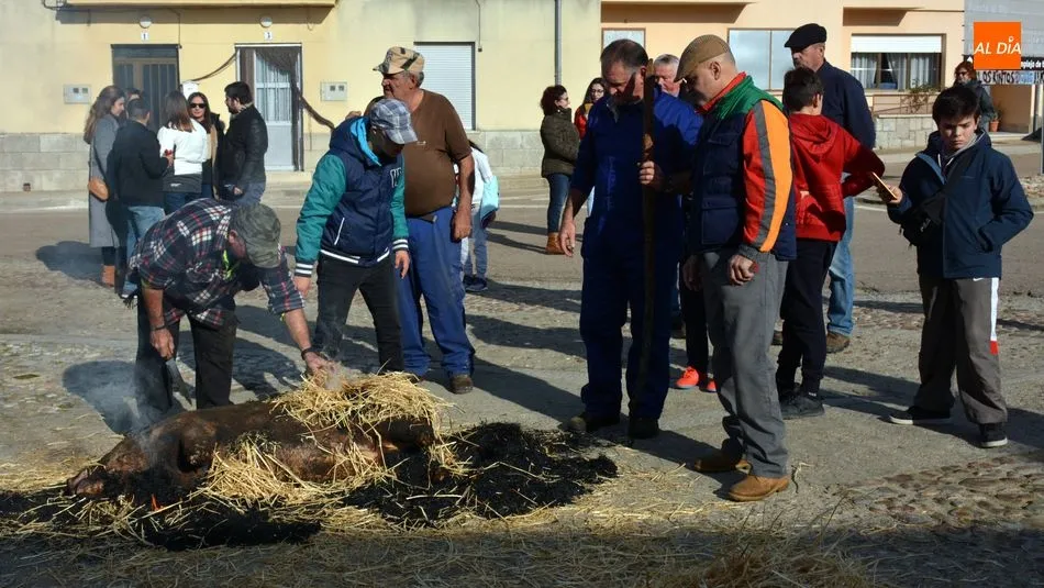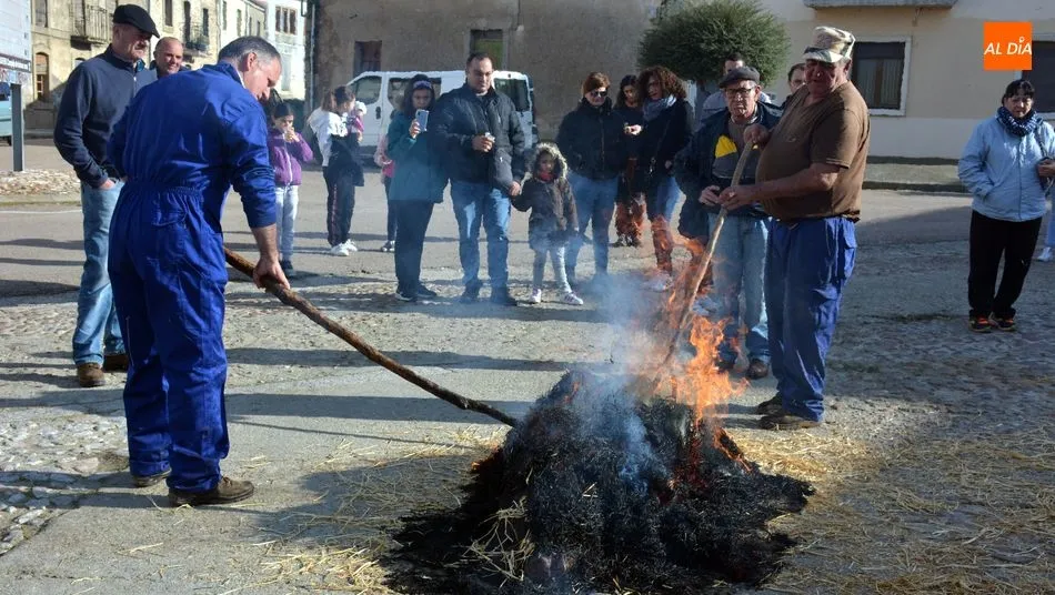 A media mañana, con la llegada a la plaza del cerdo ya sacrificado, se procedió al chamuscado del animal en una hoguera de paja y a la posterior retirada de lo chamuscado con piedras, tapaderas y agua, tarea en la que ayudó el alcalde de la villa, José Francisco Bautista.