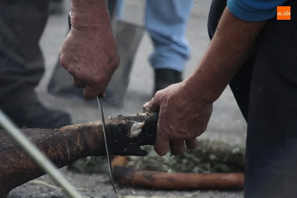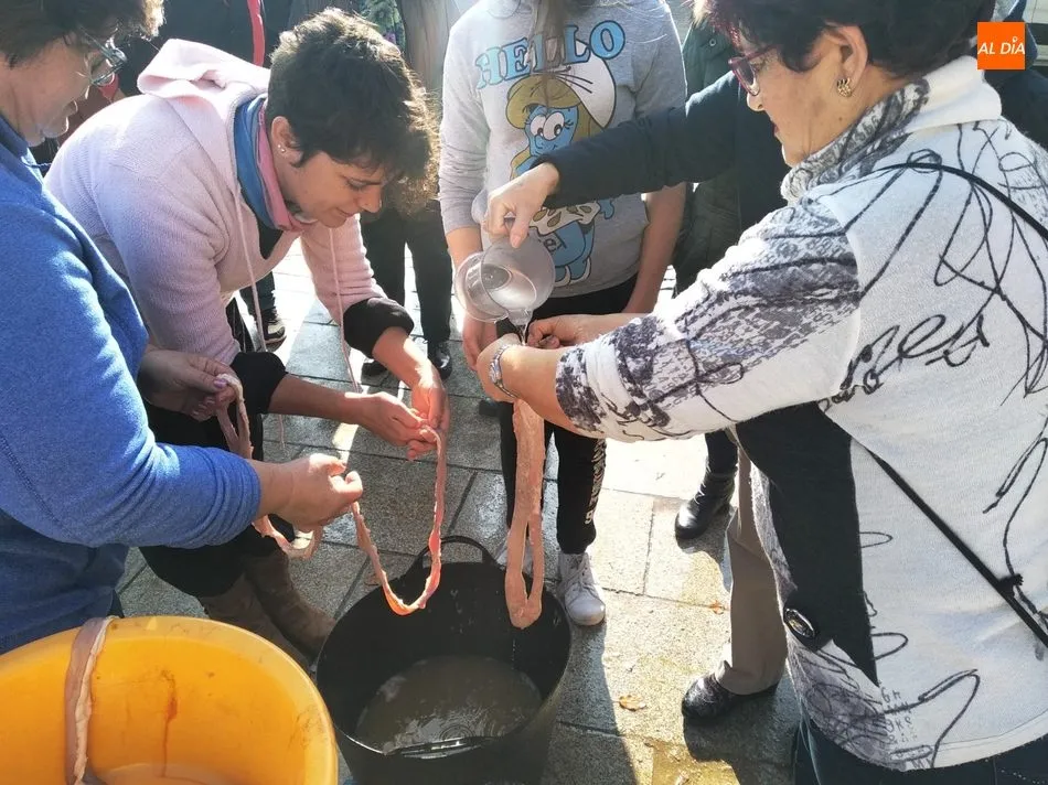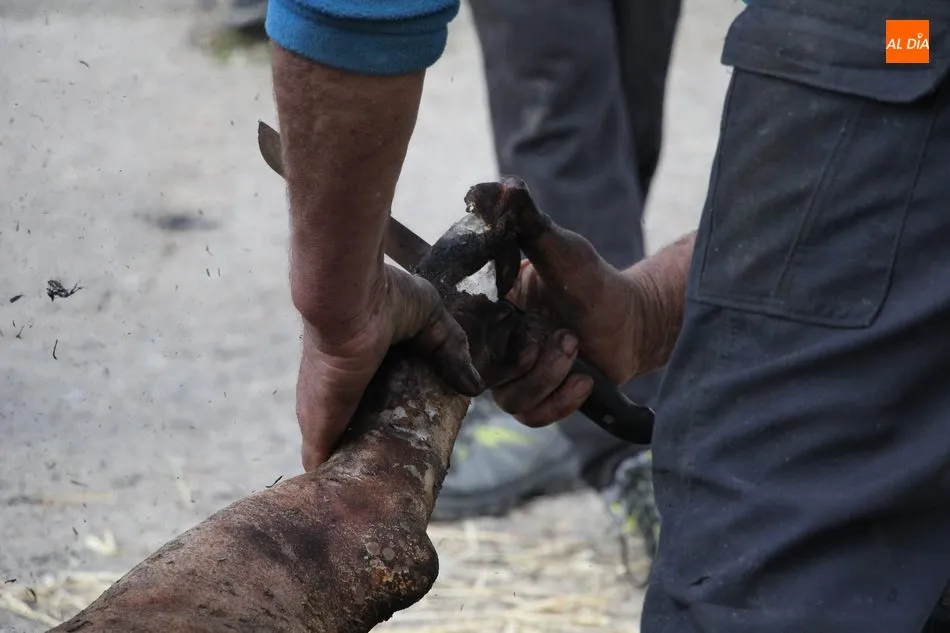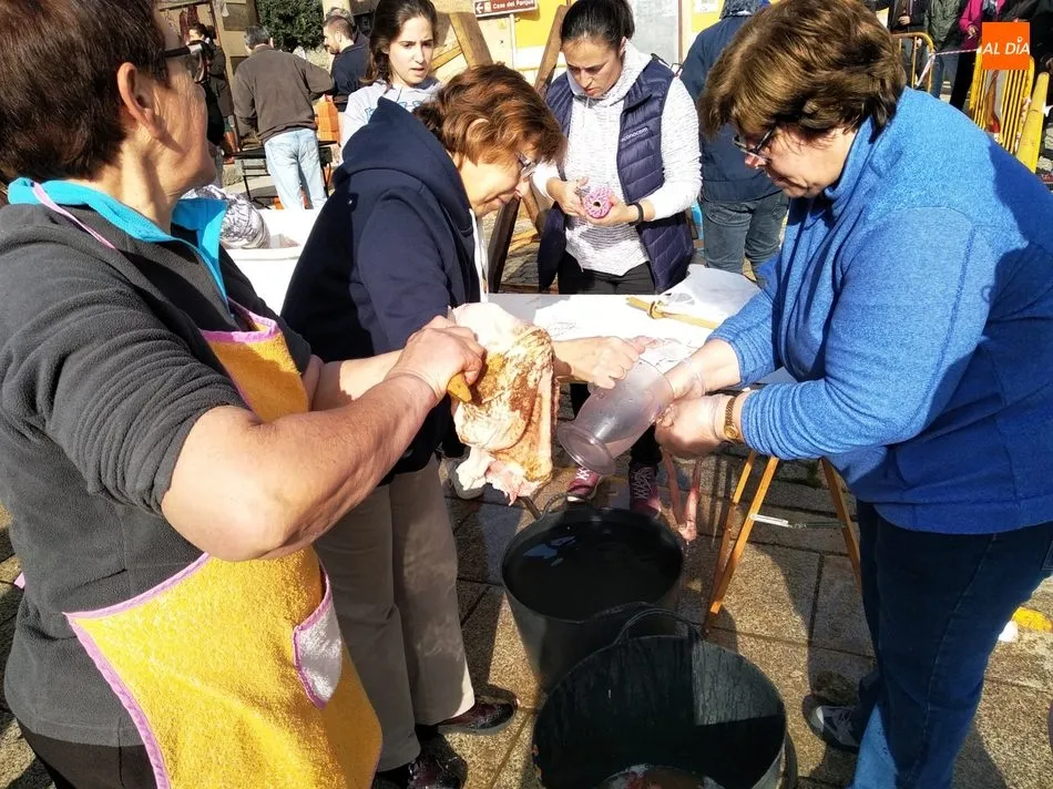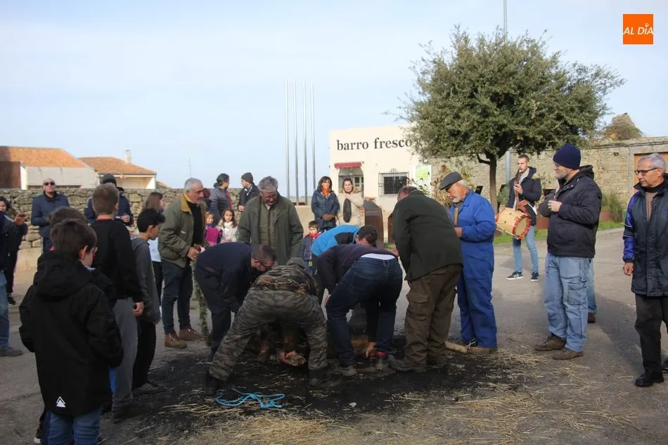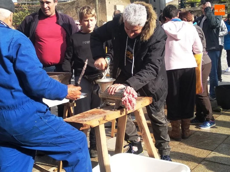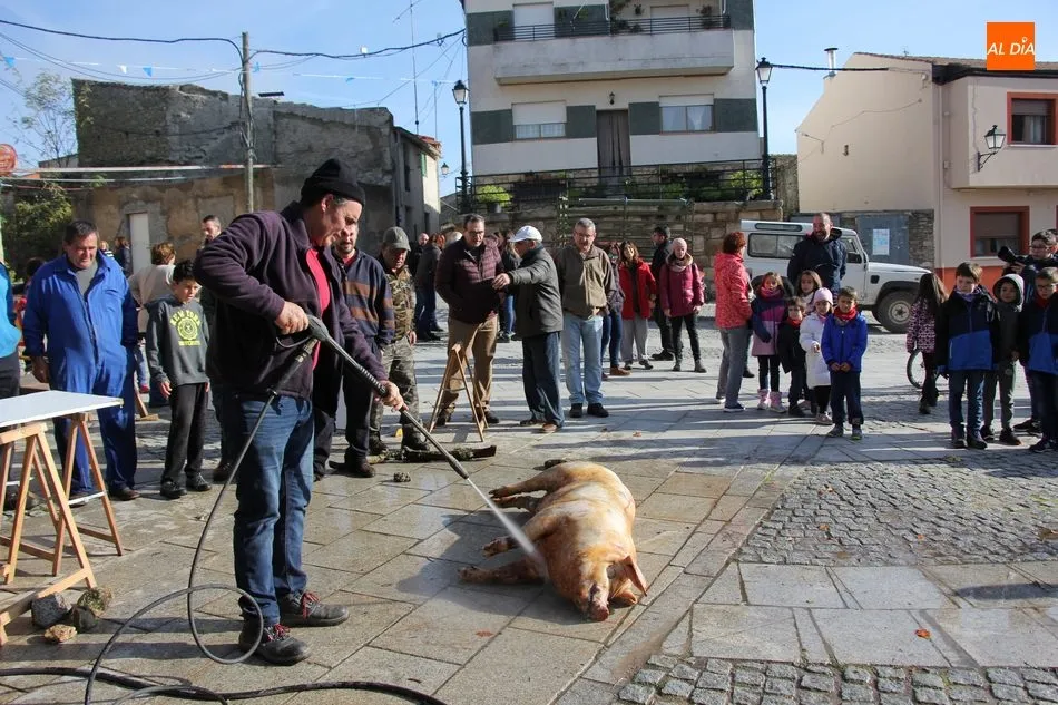 El público asistente pudo presenciar cada paso de la matanza, desde el chamuscado a la elaboración de chorizos, todo amenziado por el tamborilero de Vitigudino Alejandro Hernández