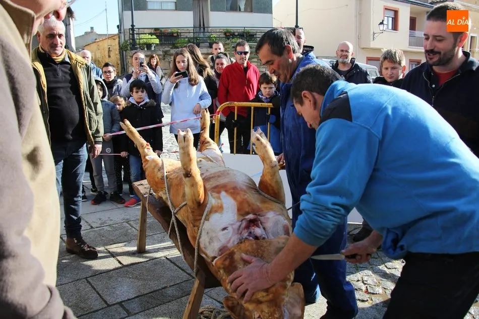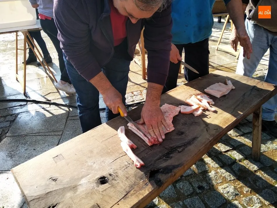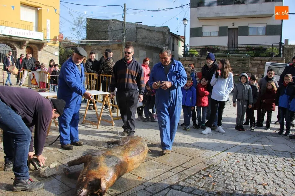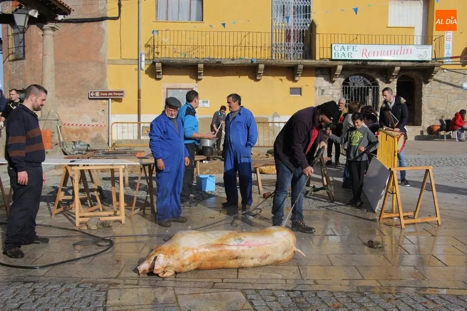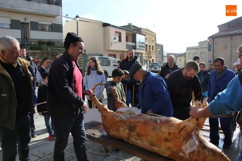 A continuación, la marrana se trasladaría de las inmediaciones de la Casa del Parque Arribes del Duero a la plaza del Ayuntamiento para su lavado y posterior despiece, labores de las que se encargarían Manolo y José con un buen grupo de colaboradores, incluido el alcalde de la localidad, José María González.
