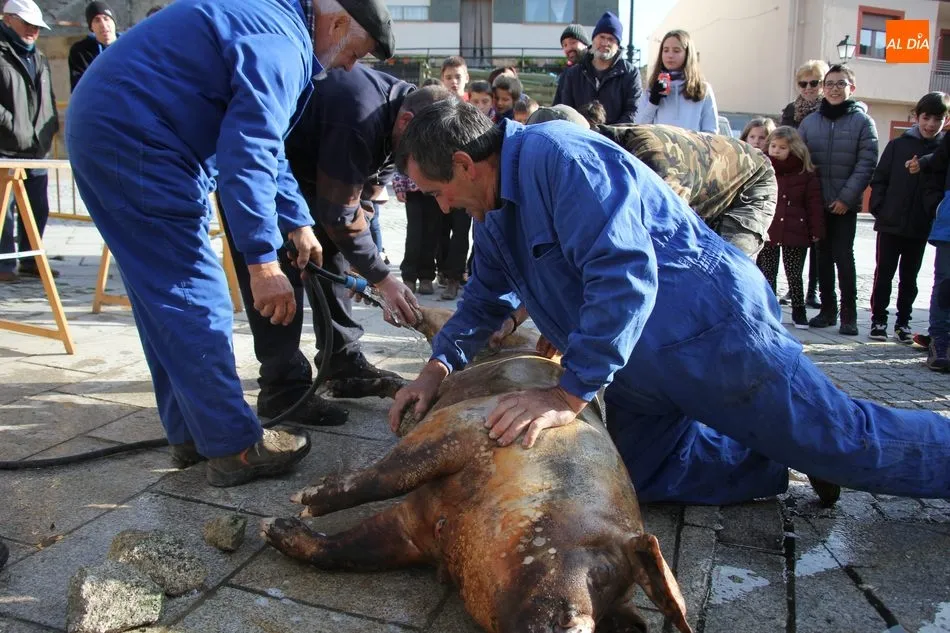 Así las cosas y después del éxito del año anterior, la plaza del pueblo daba cabida este viernes a la segunda matanza tradicional en Sobradillo, acto en el que el público asistente centraría su atención en una cochina de unos 170 kilos de carne, y que llegaba inerte a la plaza del castillo para su chamuscado, aunque antes no faltaría el típico convite de perrunillas y aguardiente.