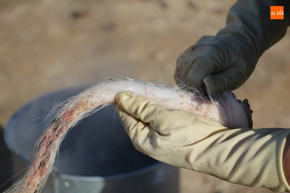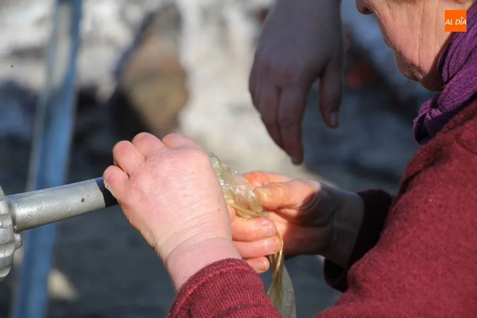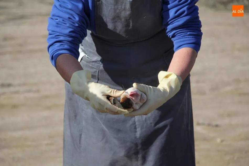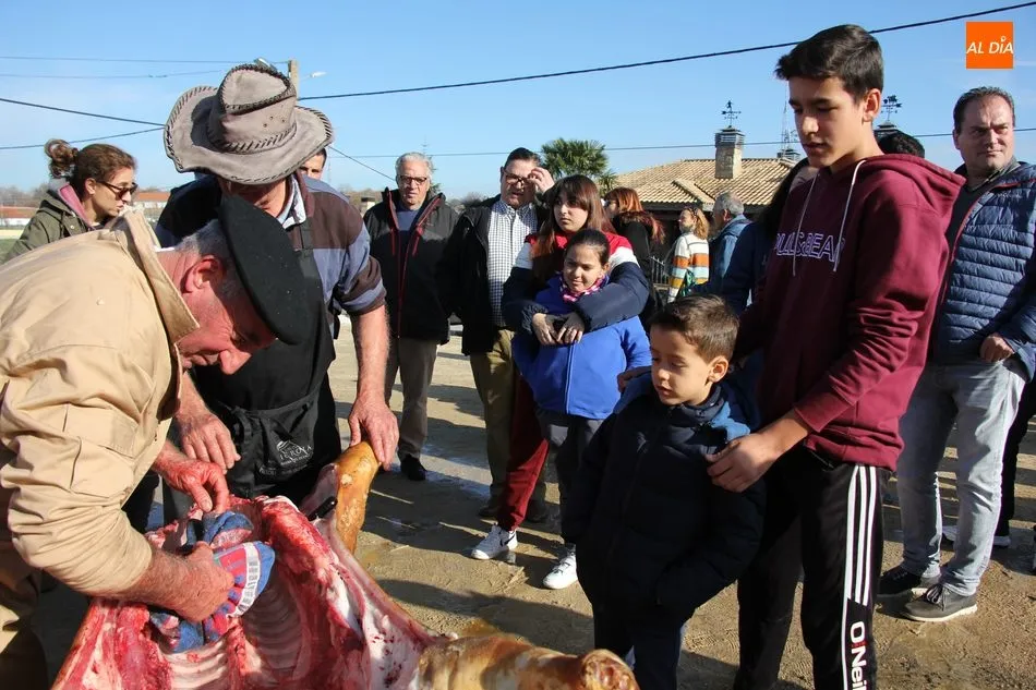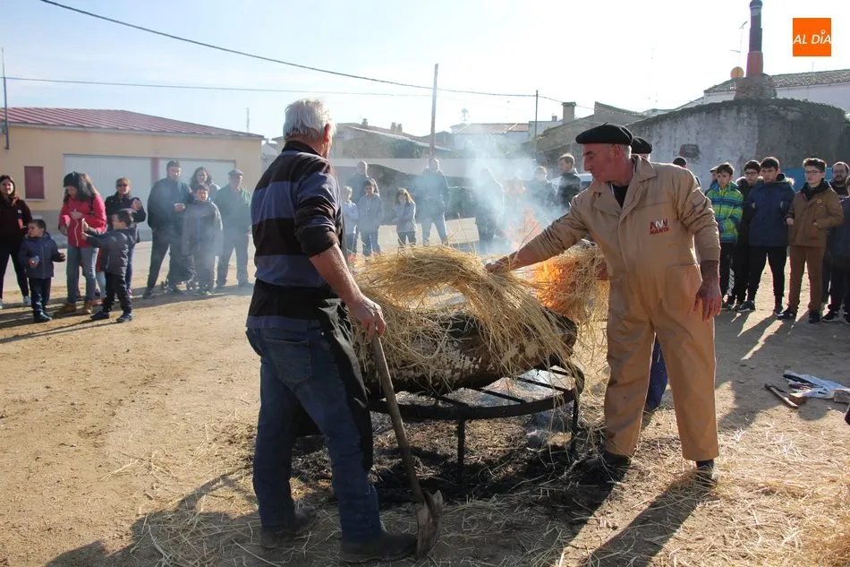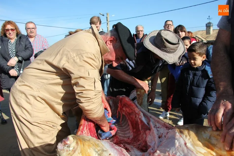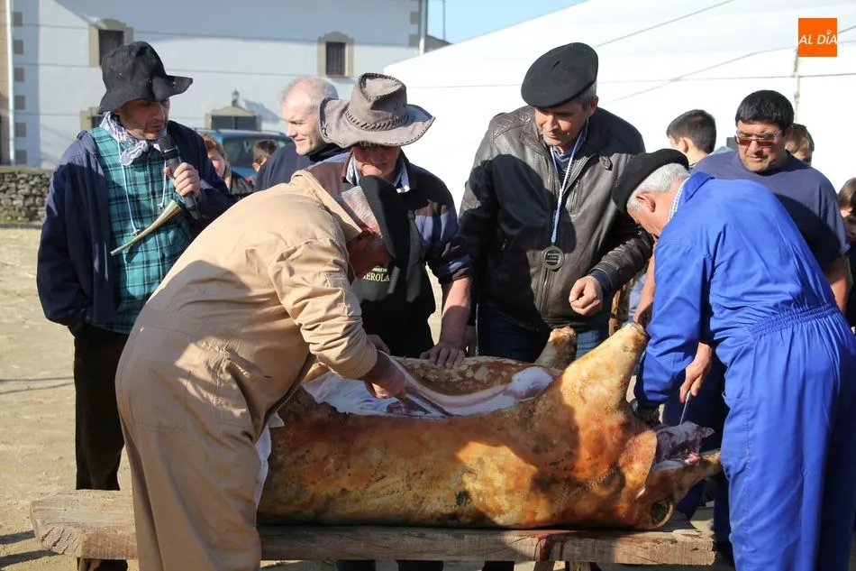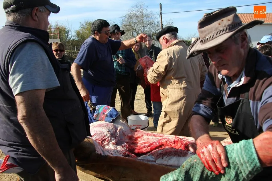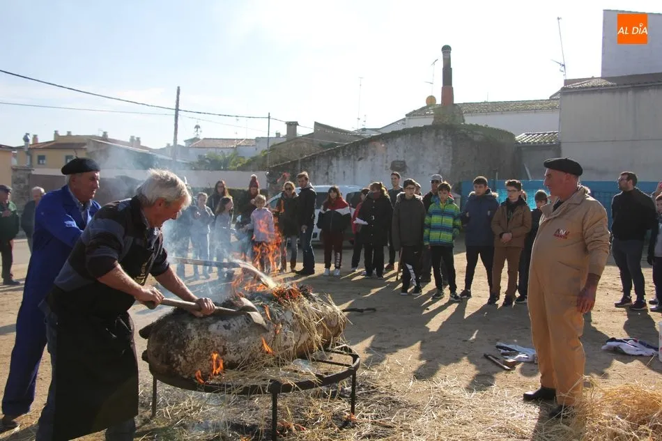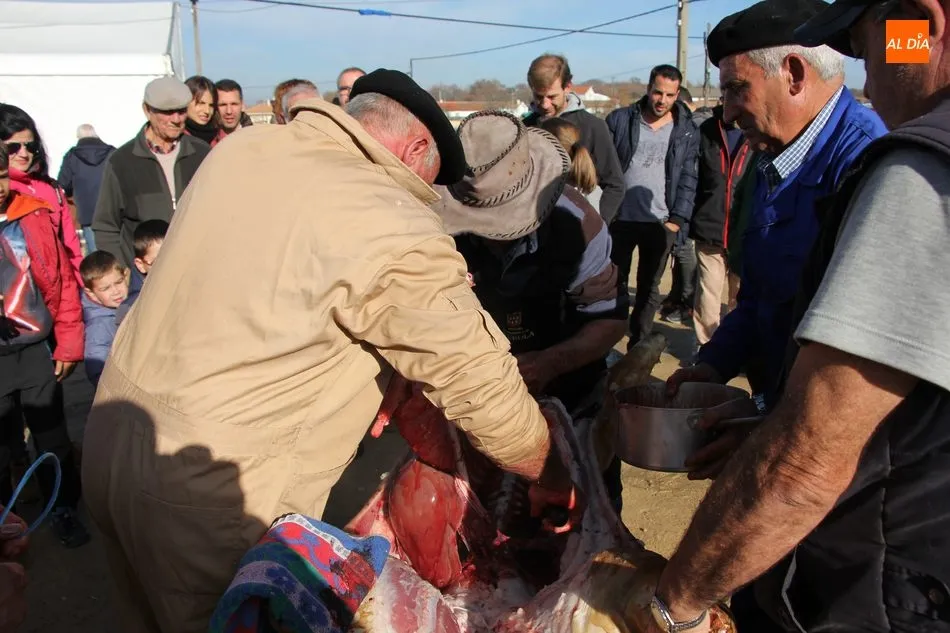 Las labores matanceras comenzaban con el chamuscado de la cochina con paja de centeno, acto al que seguía la limpieza del tocino y el despiece, paso a paso hasta quedar las hojas de tocino. A continuación seguiría una degustación de hígado encebollado, además de una comida con patatas menéas y panceta.