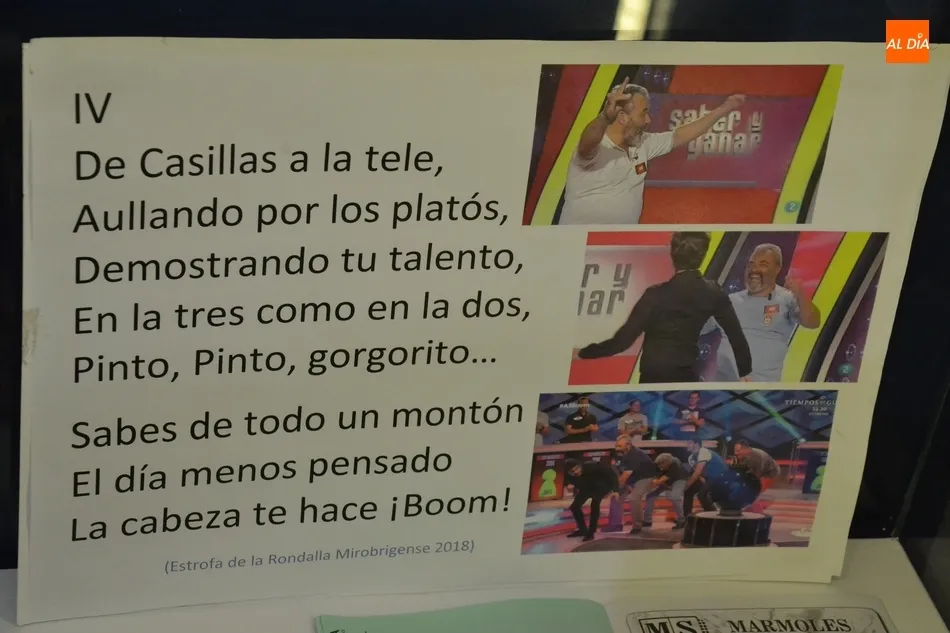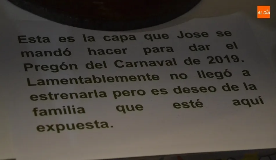 La exposición está ?presidida? por una prenda de vestir ?desconocida?: la capa que José Pinto había encargado para ponérsela en el acto del Pregón Mayor del Carnaval que tenía que haber pronunciado el 1 de marzo de este año. Además, a la entrada está colocada la pancarta de ?Gracias Pinto? que lució en lo alto del Ayuntamiento mirobrigense durante el Carnaval.