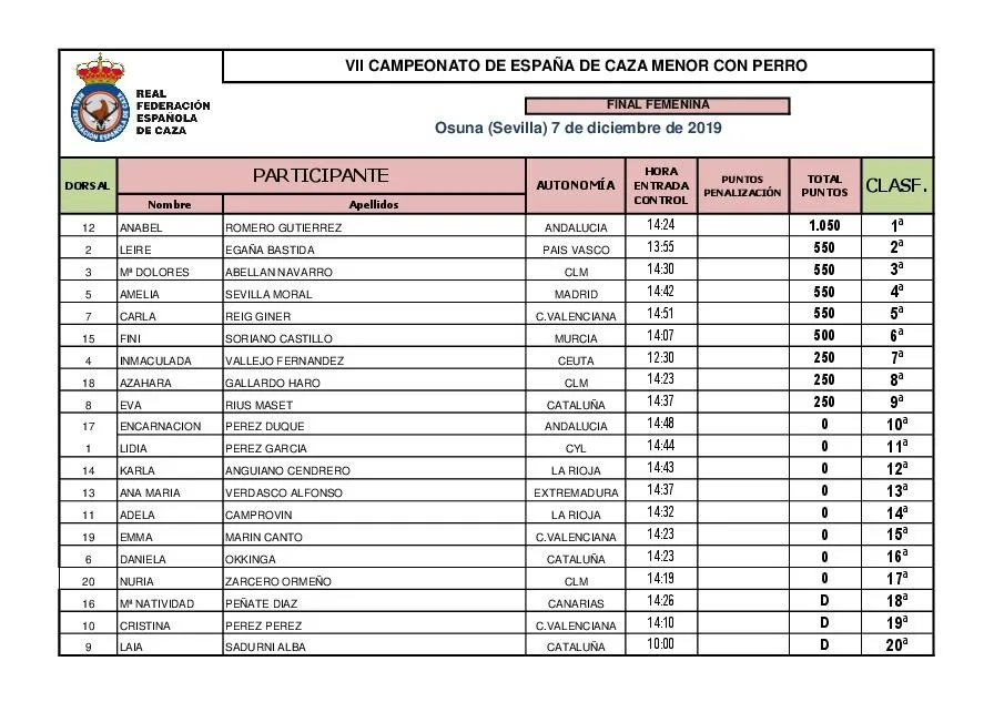 La vencedora del VII Campeonato de España de Caza Menor con Perro Femenino, Anabel Romero, de Andalucía, logró 1.100 puntos, llegando a control con su bretona ?Trufa?, a las 14:20 horas. Leire Egaña Bastida, del País Vasco, repitió como subcampeona nacional, llegando a las 13:55 horas y anotando 550 puntos, y también María Dolores Abellán Navarro, de Castilla-La Mancha, repitió su tercer puesto tras alcanzar 550 puntos y entrar a las 14:30 horas. La mirobrigense Lidia Pérez no logró cobrar ninguna pieza. (Para ver la clasificación completa, pinchar aquí).