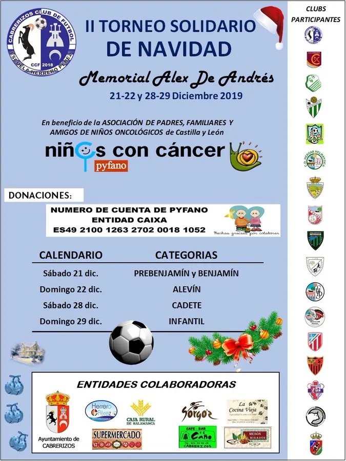El Cabrerizos organiza el torneo solidario de Navidad ?Memorial de Álex de Andrés?. Se disputarán más de 90 partidos, habrá 40 equipos de 17 clubes diferentes -con más de 400 implicados- que participen en él y los fondos irán destinados a la Asociación de Padres, Familiares y Amigos de Niños Oncológicos de Castilla y León.