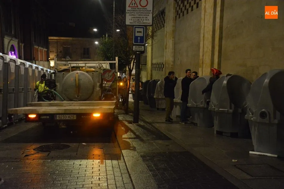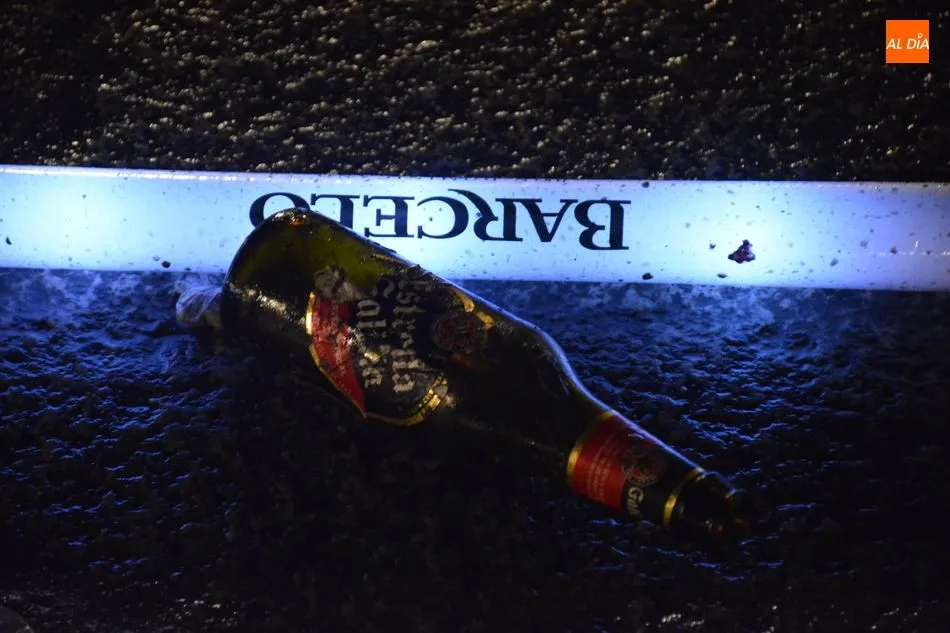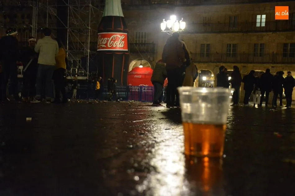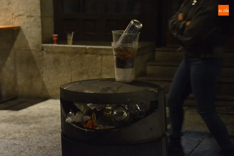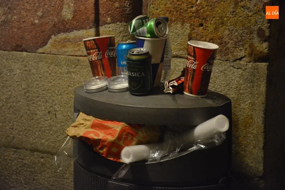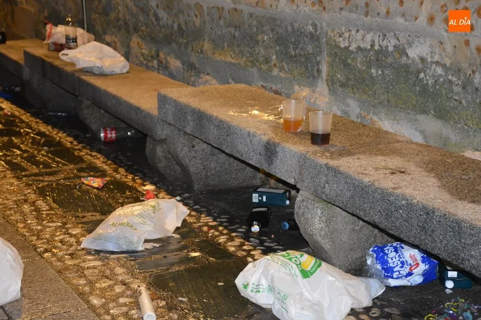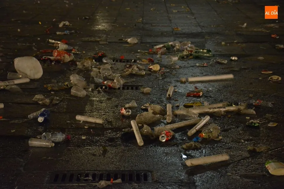 Tan tradicional como la fiesta es ver cómo uno de los mayores monumentos de la capital charra acaba lleno de botellas y diversos productos que empañan una celebración que divierte a más de 20.000 jóvenes cada año, lo que obliga a los servicios de limpieza a emplearse a fondo para eliminar el rastro del evento.